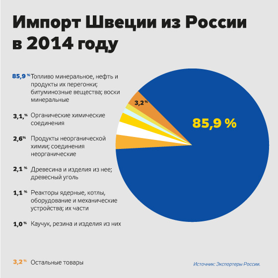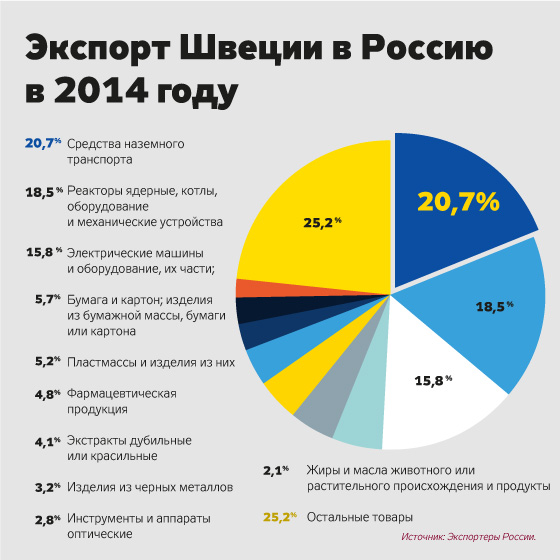 Швеция продает в Россию в основном оборудование и транспортные средства (около 40% экспорта в РФ), бумагу и картон (5,7), пластмассы (5,2%).