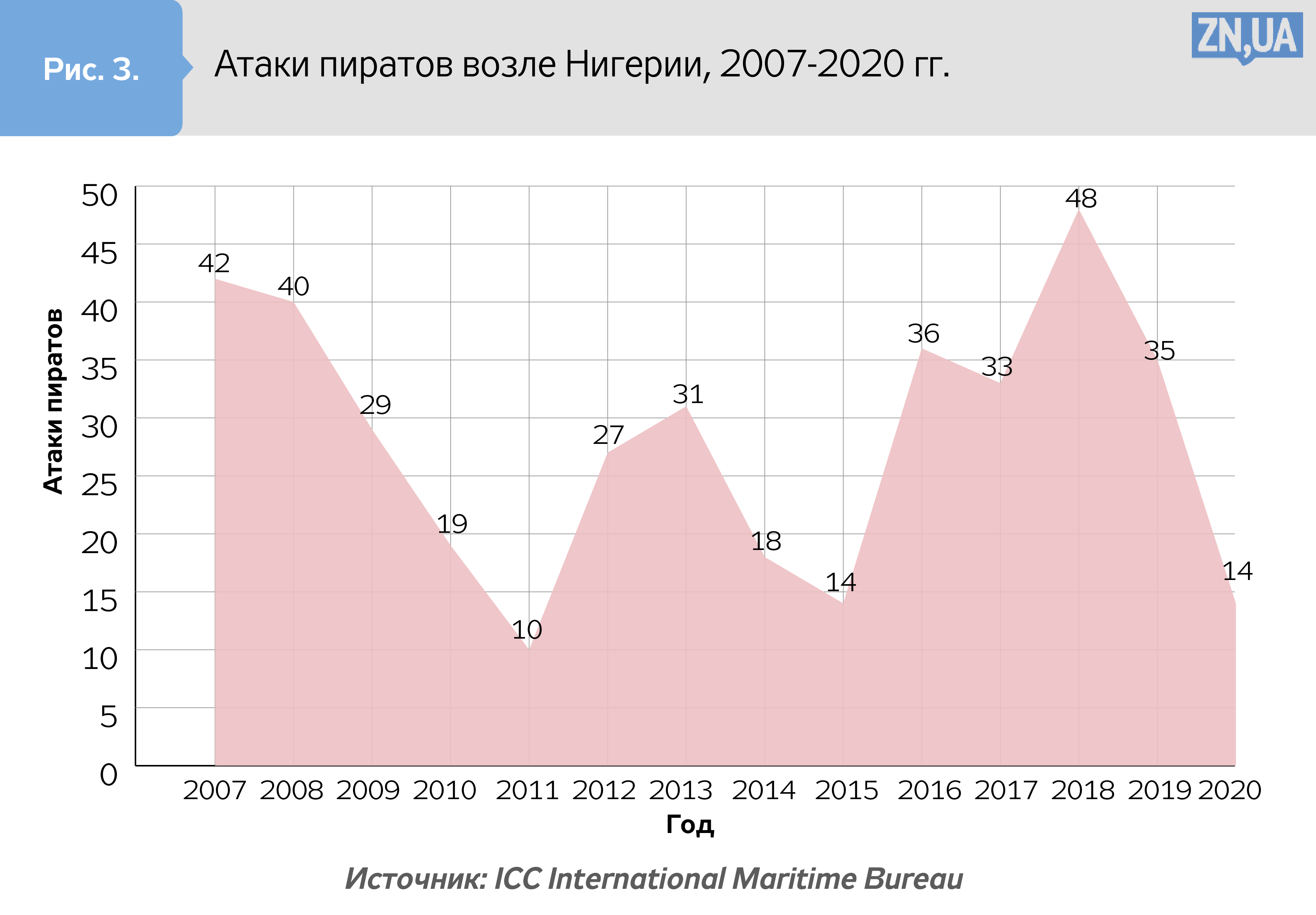 Цель террористов в дельте Нигера — блокирование добычи нефти в регионе. Террористы атакуют нефтедобывающие платформы, трубопроводы, похищают и убивают работников нефтедобывающих компаний, которые трудятся в этом районе, нападают и уводят танкеры с нефтью у побережья. Кроме террористов, пиратство как источник дохода используют местные уголовные группировки, безработная молодежь и коррумпированные чиновники. В 2018 г. зафиксировали самое большое за 10 лет количество нападений пиратов возле берегов Нигерии. Судя по динамике, тенденция к росту активности пиратов в этом районе будет лишь усиливаться, особенно с учетом тяжелых экономических последствий падения цен на нефть и пандемии коронавируса.