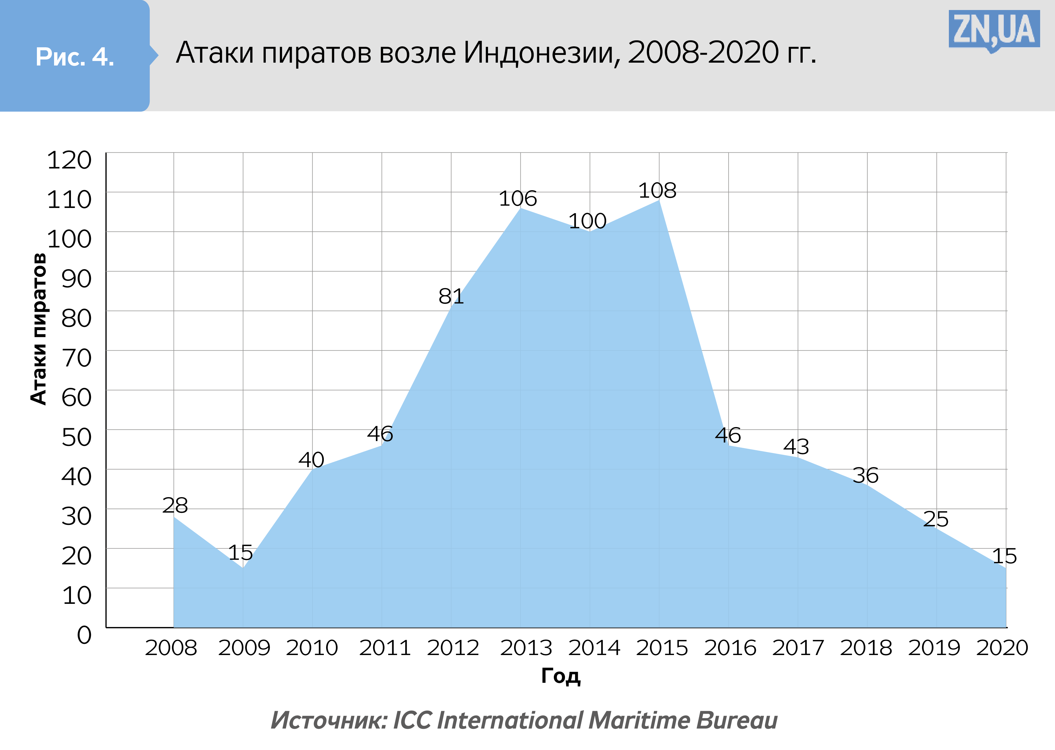 Больше всего атак фиксируется у побережья Индонезии. Береговая линия этой страны составляет почти 55 тыс. километров. Трудно представить, какие понадобятся силы, чтобы ее контролировать. Поэтому не удивительно, что именно эта страна занимает первое место в мире по количеству пиратских нападений за последние пять лет. В районе Малаккского пролива пиратами становятся местные рыбаки, филиппинские террористы из «Абу Сайяф», местные сепаратисты, контрабандисты и безработные. Чаще всего, как свидетельствует статистика, атакам подвергаются корабли в портах или около берегов. Атакуют ночью, обычно небольшими группами из 3–5 человек, в половине случаев — даже без оружия, поэтому члены команд похищенных кораблей почти всегда остаются живыми и невредимыми. Пираты-заробитчане изредка захватывают корабли. Обычно они просто разгружают часть товара и сбегают. Намного опаснее нападения пиратов-террористов с целью похищения для получения выкупа. В июле нынешнего года корабли, курсировавшие в районе Филиппин и Малайзии, были информированы об угрозе новых нападений со стороны террористов из «Абу Сайяф», вновь начавших охоту на моряков.