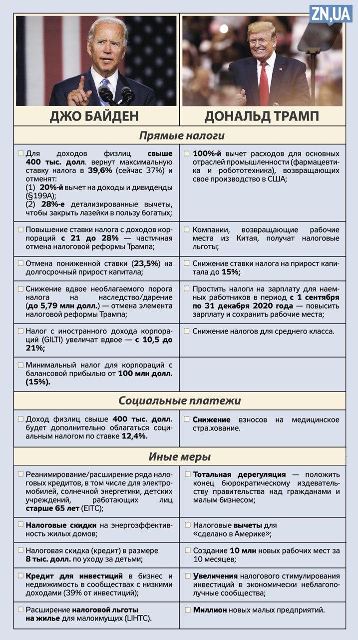 Джо Байден пока не выпустил ни одной официальной предвыборной программы в сфере налогообложения, но он предложил множество налоговых изменений, связанных с финансированием изменения климата, сфер инфраструктуры, здравоохранения, образования, инноваций etc. Большинство из этих предложений приводят к росту расходов бюджета, их предлагается компенсировать путем повышения прямых налогов. Для налогоплательщиков, по предварительным данным, стоимость инициатив составит около 380 млрд долл. в год. Часть предлагаемых шагов является прямой отменой налоговой реформы Трампа. Таким образом, суть новой налоговой политики Джо Байдена можно охарактеризовать как усиление налогового давления за счет более высоких налогов для богатых и корпораций в сочетании с налоговым стимулированием некоторых социальных программ для людей старшего возраста, людей с низкими доходами, семей с детьми и домашних хозяйств.