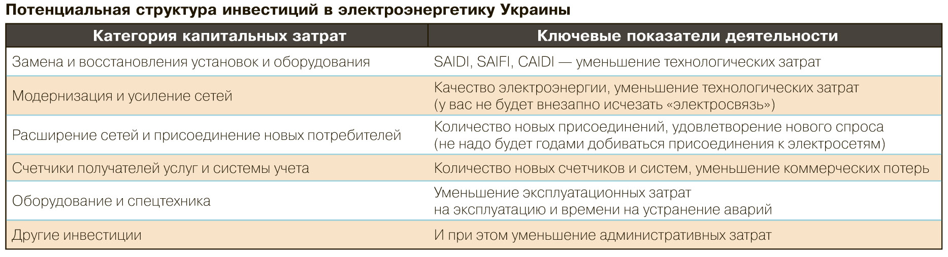 - Только действенная тарифная реформа может обеспечить стимулы для долгосрочных инвестиций в энергетическую инфраструктуру. Украина сейчас находится в процессе перехода от методологии "затраты плюс" к методологии стимулирующего регулирования (RAB) в электроэнергетическом секторе. USAID предоставляет помощь регулятору в том, чтобы в рамках RAB-тарифа обеспечить возможности для инвестиций в развитие сетей таким образом, чтобы предприятия могли финансировать эти шаги, а регулятор имел возможность отслеживать этот процесс (см. табл.).