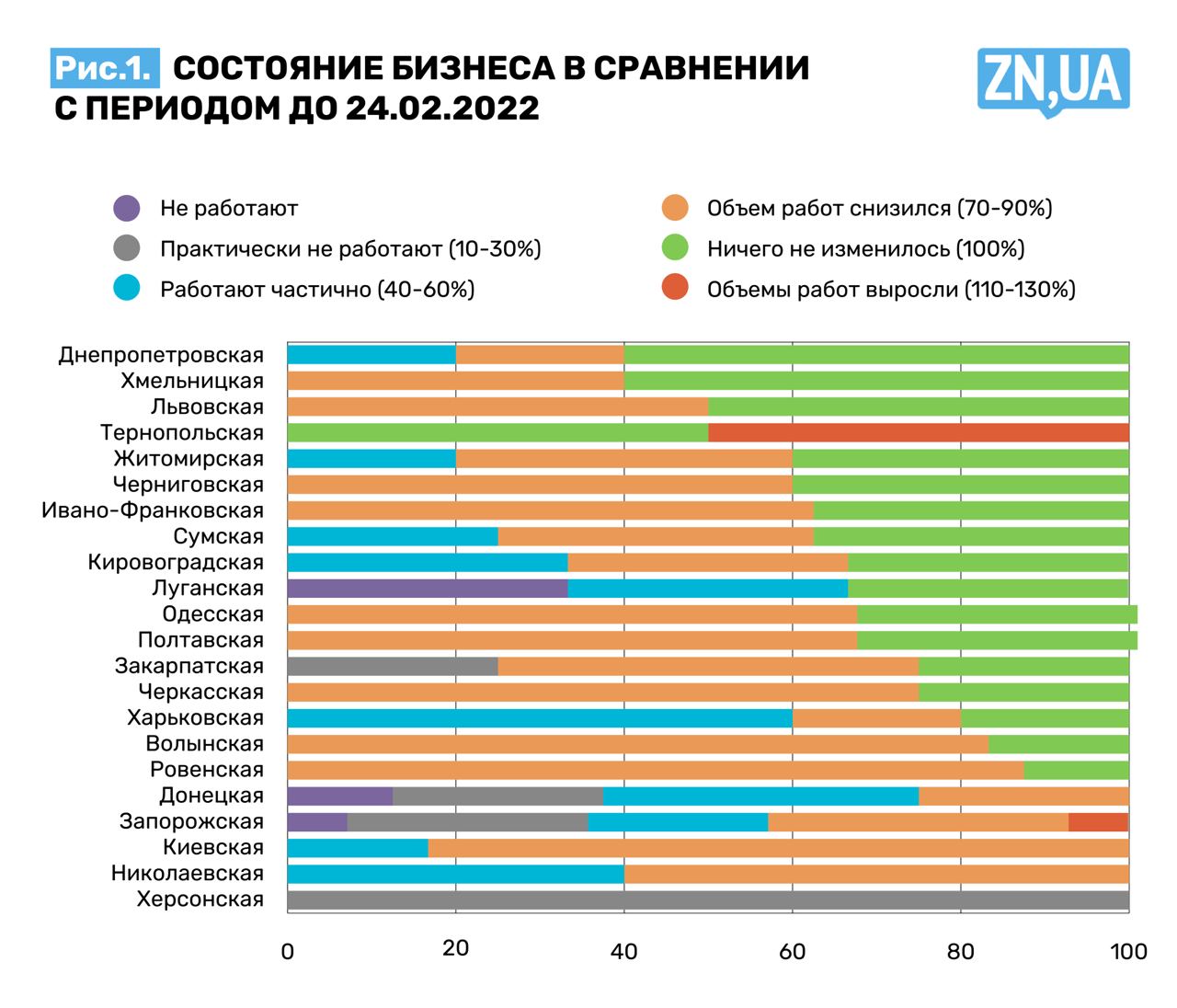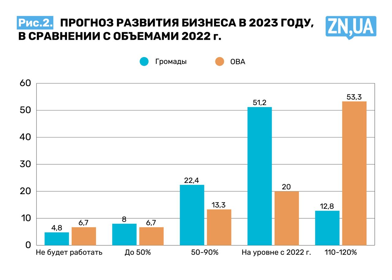 Примерно треть опрошенных представителей бизнеса во всей Украине предполагают, что 2023 год изменений не принесет. В западных, северных, центральных и южных областях от 13 до 17% респондентов мечтают о росте на 10–20%. На востоке треть опрошенных ожидает полной остановки бизнеса.