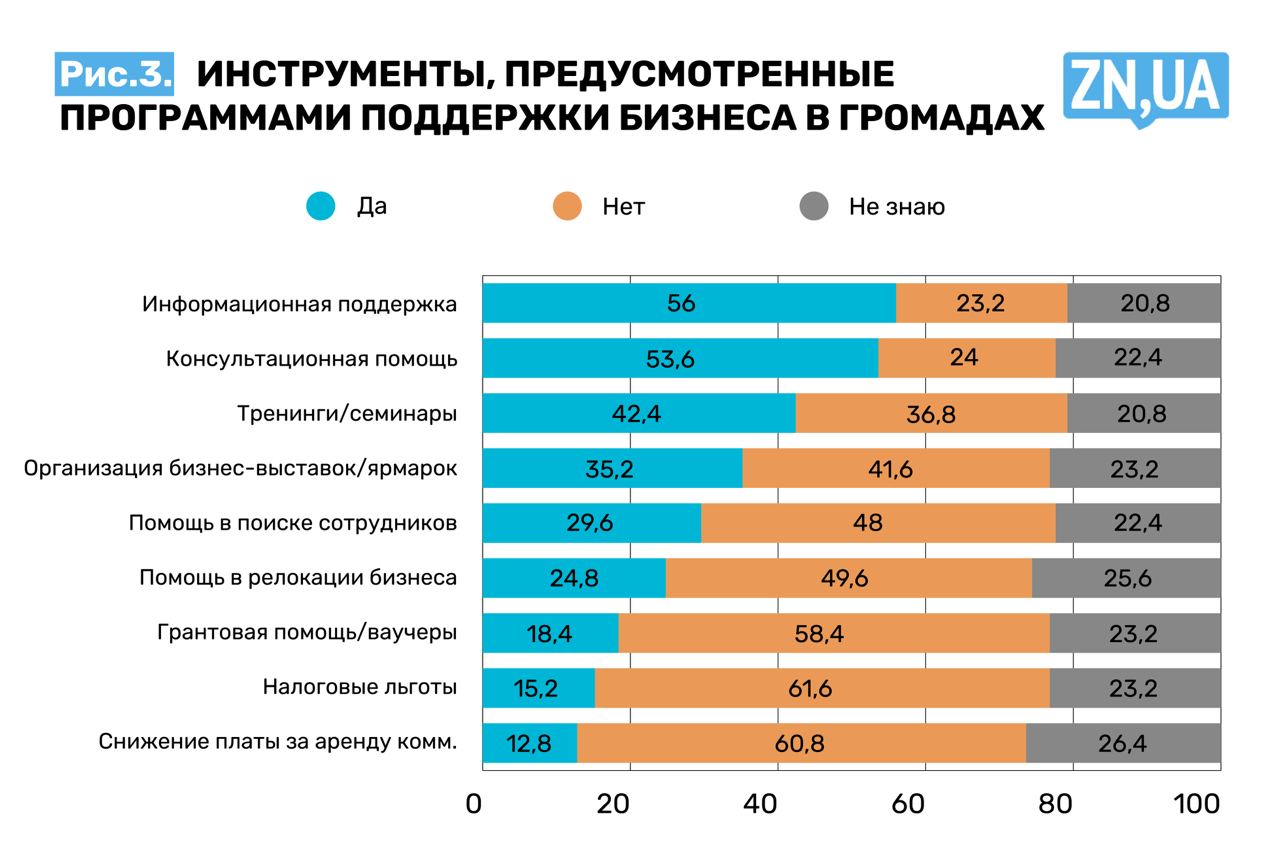 Тем не менее в 17 громадах выделялись средства из местных бюджетов на реализацию программ поддержки предпринимательства. Объем финансирования — от 2 до 501 млн грн, средний размер выделенных средств — 33 млн грн. В восьми областях в 2022 году также выделялись средства на финансирование программ поддержки предпринимательства, объем финансирования — от 8 до 232 млн грн.