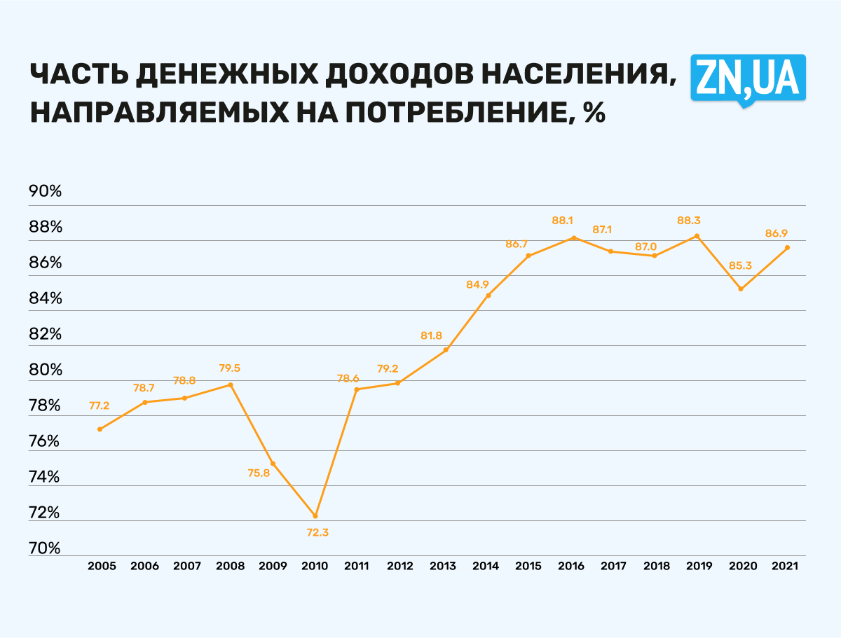 Преобладающая часть доходов украинцев тратится на потребление. Это не очень утешительный тренд с учетом того, что накопленные средства граждан — тоже источник инвестиций. Собственно, в развитых странах эти средства являются мощным стимулом для развития как финансовой системы как такой, так и различных ее инструментов.