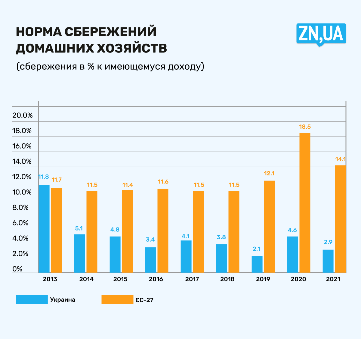 Основная причина падения уровня национальных сбережений, в том числе и сбережений граждан, — критическая ситуация с уровнем доходов населения. Собственно, формирование сбережений домашних хозяйств начало стремительно ухудшаться с 2014 года. Норма сбережений населения за последние десять лет упала ниже 5%, в 2021-м составляла 2,9%, что в пять раз (!) меньше уровня стран ЕС (см. рис. 4). Сектор домашних хозяйств Украины характеризуется самым низким в Европе уровнем покупательной способности и склонности к сбережениям. Это угнетает как совокупный спрос экономики, так и возможности банковской системы выступать эффективным финансовым посредником.