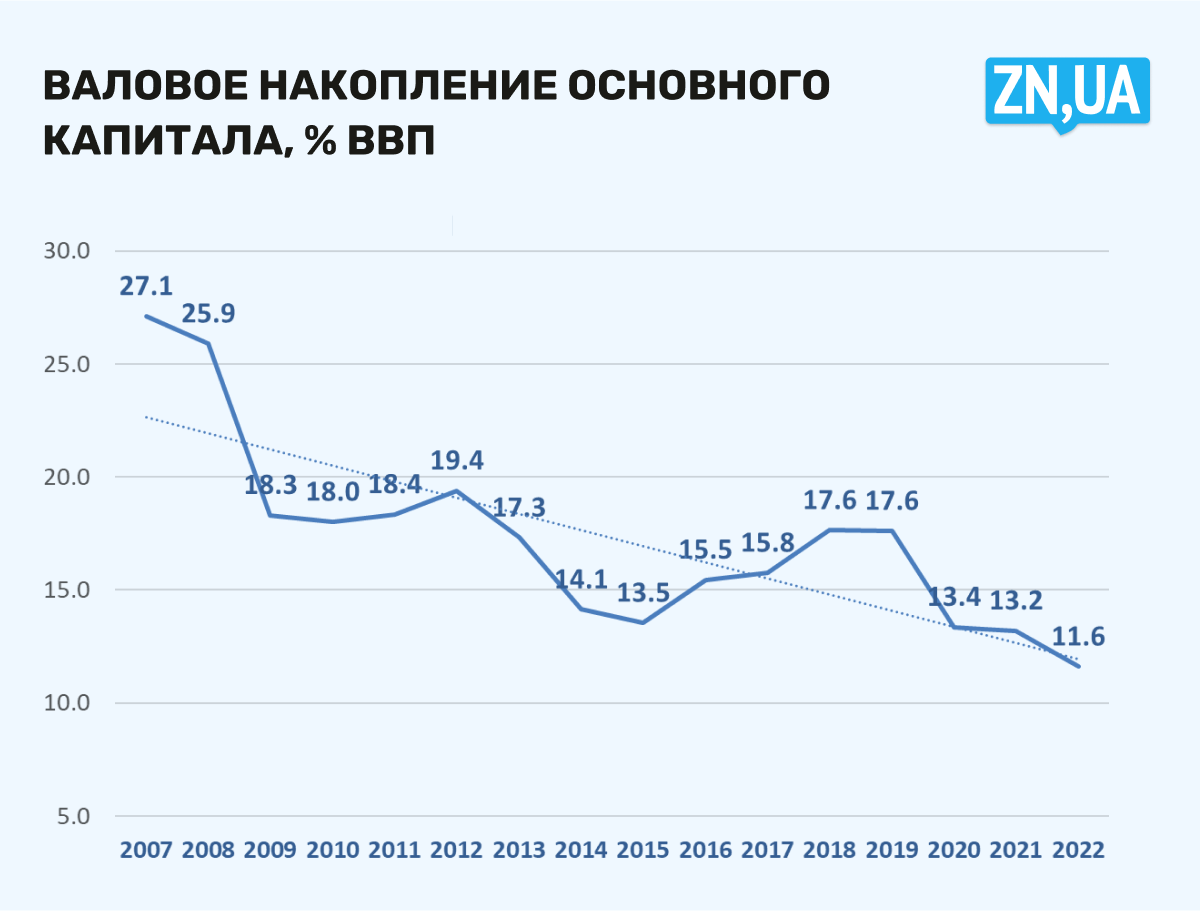 Мы только мечтаем о западных инвесторах и их миллионах, но до сих пор основным источником инвестиций украинских предприятий стабильно являются их собственные средства: в среднем за 2017–2021 годы — 70%. Займы банков составляют всего 5% среди источников инвестиций, средства иностранных инвесторов — 3, государственные средства — 15%. Ограниченность внешних ресурсов финансирования тормозит инвестиционное развитие предприятий, сдерживает экономическое восстановление страны.
