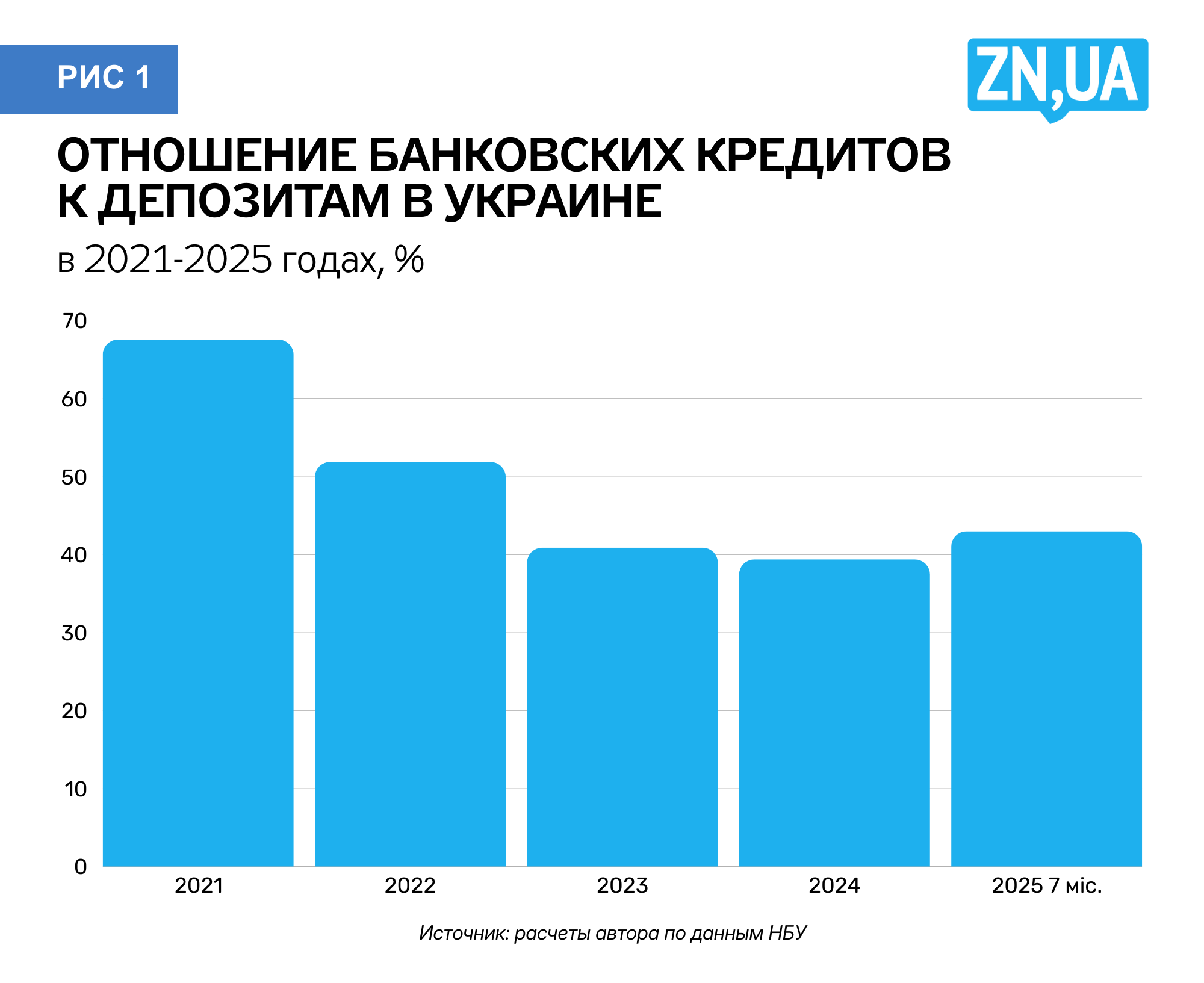 Отношение суммарных банковских кредитов к депозитам (динамика приведена на рис. 1) с начала войны уменьшилось в 1,7 раза — с 67,6% в 2021 году до 39,4% 2024-м с повышением до 43% в июле 2025 года. То есть сейчас банки использовали всего лишь 43% депозитов на предоставление кредитов субъектам хозяйствования и домохозяйствам.