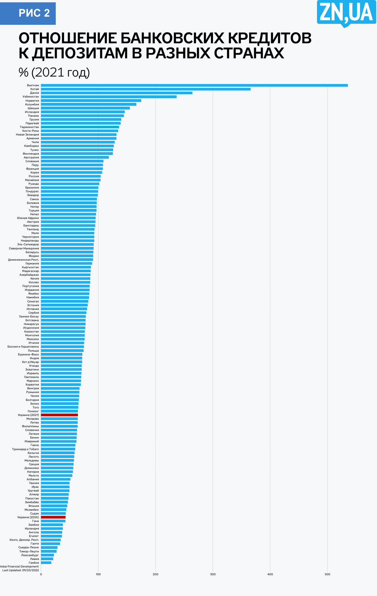 В противовес этому в таких странах, как Армения, Новая Зеландия, Коста-Рика, Таджикистан, Парагвай, Грузия, Панама, Исландия, Швеция, Колумбия, Норвегия, Узбекистан, Дания, Вьетнам и Китай, отношение банковских кредитов к депозитам превышало 130%. У ближайших соседей Украины это отношение составляло 64% в Молдове и Литве, 66 — в Болгарии, 67 — в Чехии, Румынии и Венгрии, 75 — в Польше, 92 — в Беларуси и 109% — в Словакии.