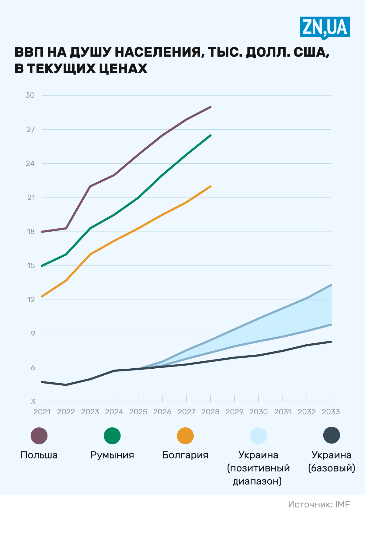 При этом даже такой оптимистичный ход событий недостаточен, чтобы догнать по уровню развития соседние страны Восточной Европы. Рассмотрим это на примере Польши. Не секрет, что в течение последних 30 лет экономическое отставание Украины от Польши постепенно увеличивалось. По данным МВФ, по состоянию на конец 2020 года ВВП по паритету покупательной способности на одного человека в Украине и Польше составлял 13,1 тыс. долл. и 34,1 тыс. долл. соответственно. И до войны, согласно вполне обоснованным предположениям роста потенциального ВВП для Польши и Украины в 2,5 и 4% в год соответственно при неизменном количестве населения, на преодоление такого разрыва Украине понадобилось бы около 60 лет. Темп роста реального ВВП, который бы позволил Украине преодолеть этот разрыв за 20 лет, еще до начала полномасштабного вторжения составлял 7,5% в год. Сохранение разрыва в уровне доходов по сравнению с другими странами региона на горизонте ближайших десяти лет также подтверждается расчетами специалистов МВФ (см. рис.).