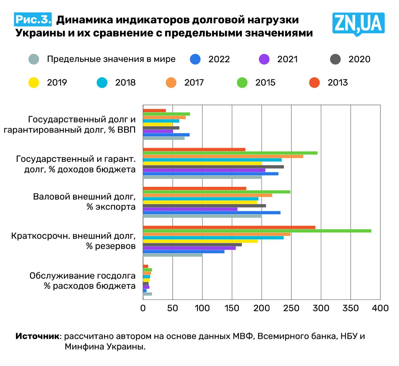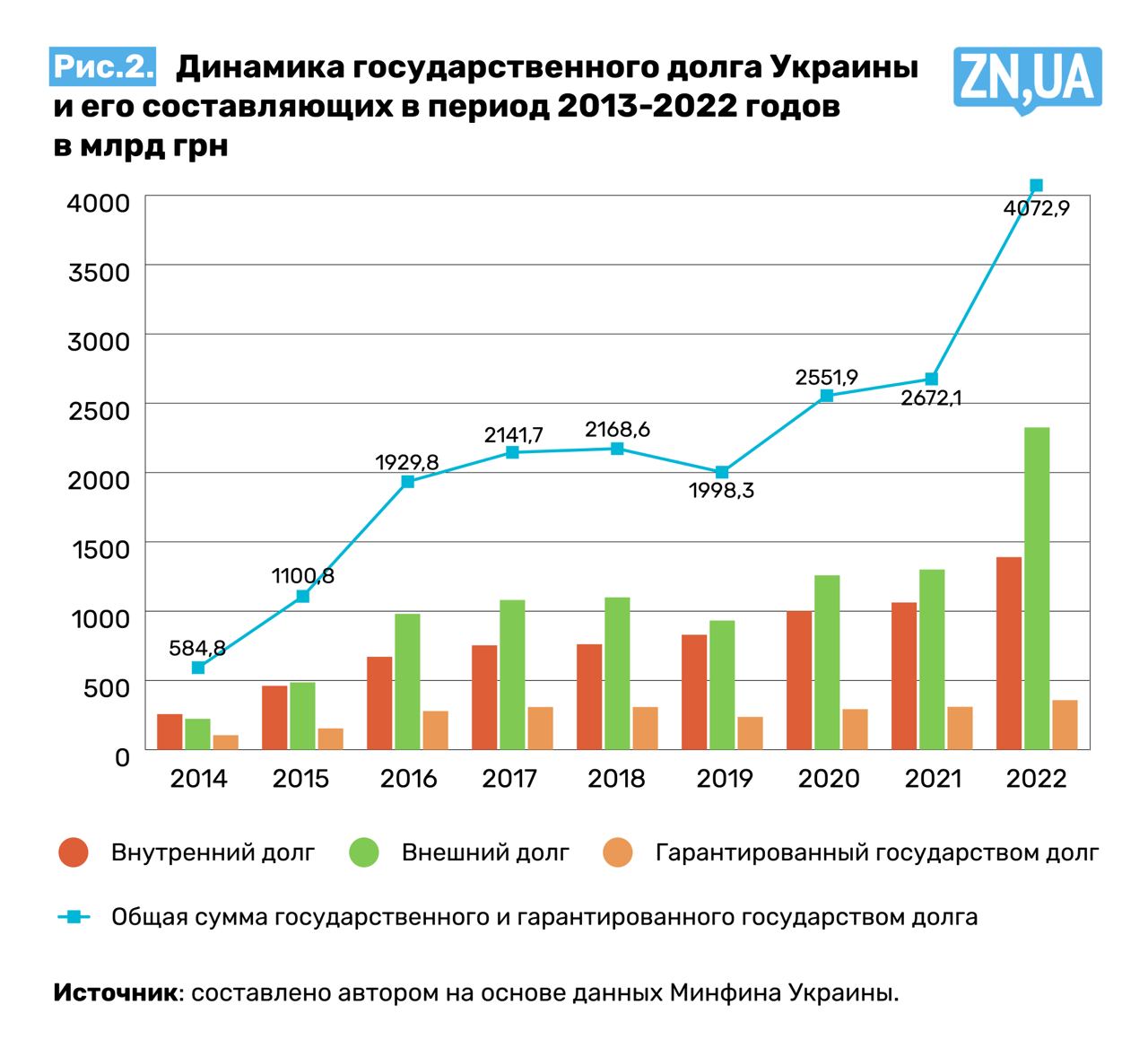 За 2022 год и четыре месяца 2023-го общая сумма государственного и гарантированного долга, выраженная в гривнях, увеличилась на 1,9 трлн грн, или на 70%. В апреле 2023 года величина долга достигла 4,54 трлн грн, или 124,3 млрд долл. Эта сумма эквивалентна 87,6% ВВП за 2022 год.