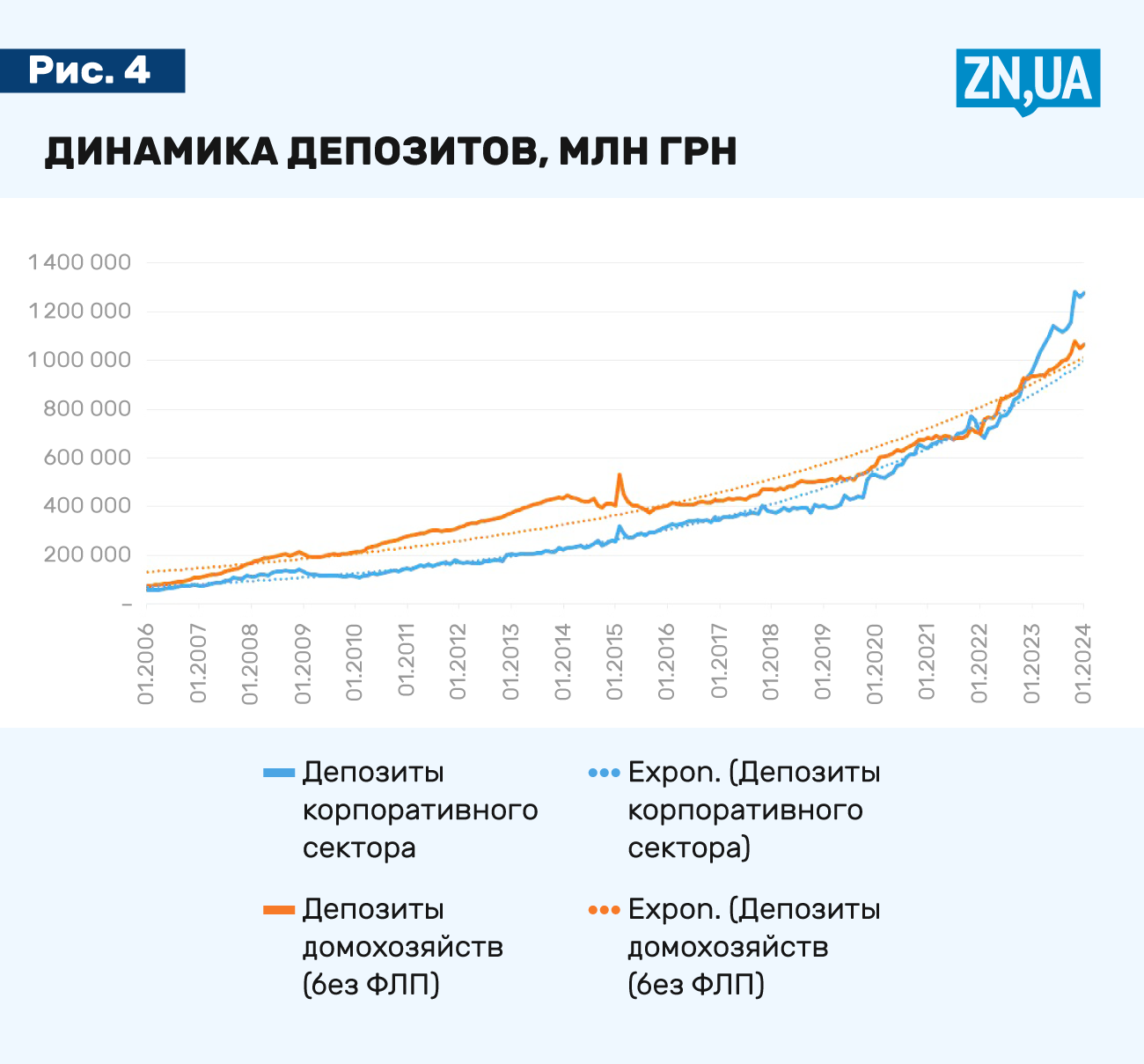 Достаточно высокий уровень учетной ставки содействует тому, что объемы депозитов в номинальном измерении растут, что снижает давление на валютном рынке и, соответственно, на валютные резервы. Интересно, что депозиты у населения и бизнеса прирастают даже быстрее трендового значения (см. рис. 4). Более существенное отклонение вверх от тренда депозитов бизнеса указывает на то, что компании сталкиваются с проблемой инвестиционных ниш больше, чем с проблемой доступности ресурсов, в частности кредитов. Поскольку ограничения инвестиционных возможностей имеют военную, а не экономическую природу, это является дополнительным фактором риска со стороны чрезмерной ликвидности. Именно поэтому сохранение довольно высокой учетной ставки остается важным элементом, чтобы избежать валютных кризисов и минимизировать риски. К счастью, политика НБУ этой задаче сейчас отвечает.