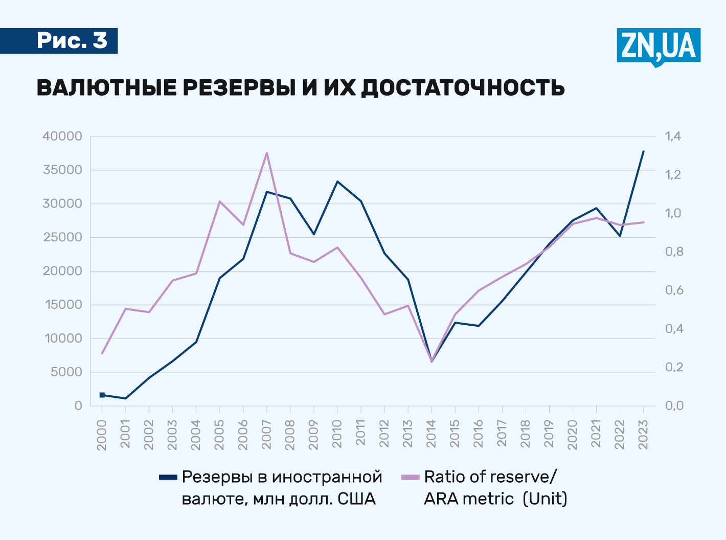 Ответить на этот вопрос поможет динамика достаточности валютных резервов. В течение длительного периода объемы валютных резервов в Украине двигались параллельно с показателем их достаточности. Последний определяется как соответствие между фактическим объемом резервов и объемом, рассчитанным с использованием критериев адекватности (adequacy reserves assessment, ARA), разработанных МВФ. Такие критерии учитывают не только покрытие резервами месяцев импорта, но и объемы денежной массы, и внешнюю задолженность. То есть ARA-методика допускает давление на валютные резервы со стороны внешних и внутренних факторов.