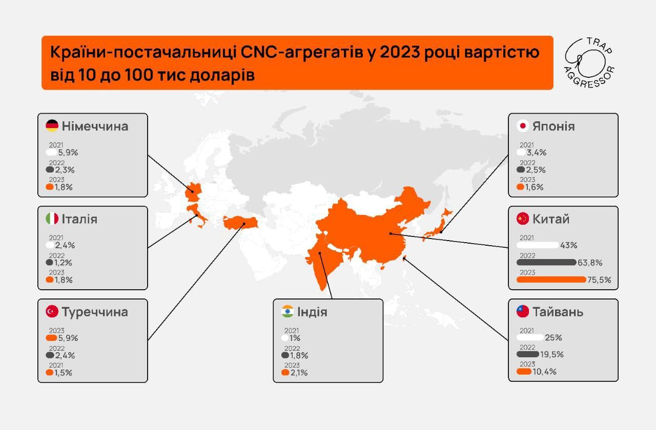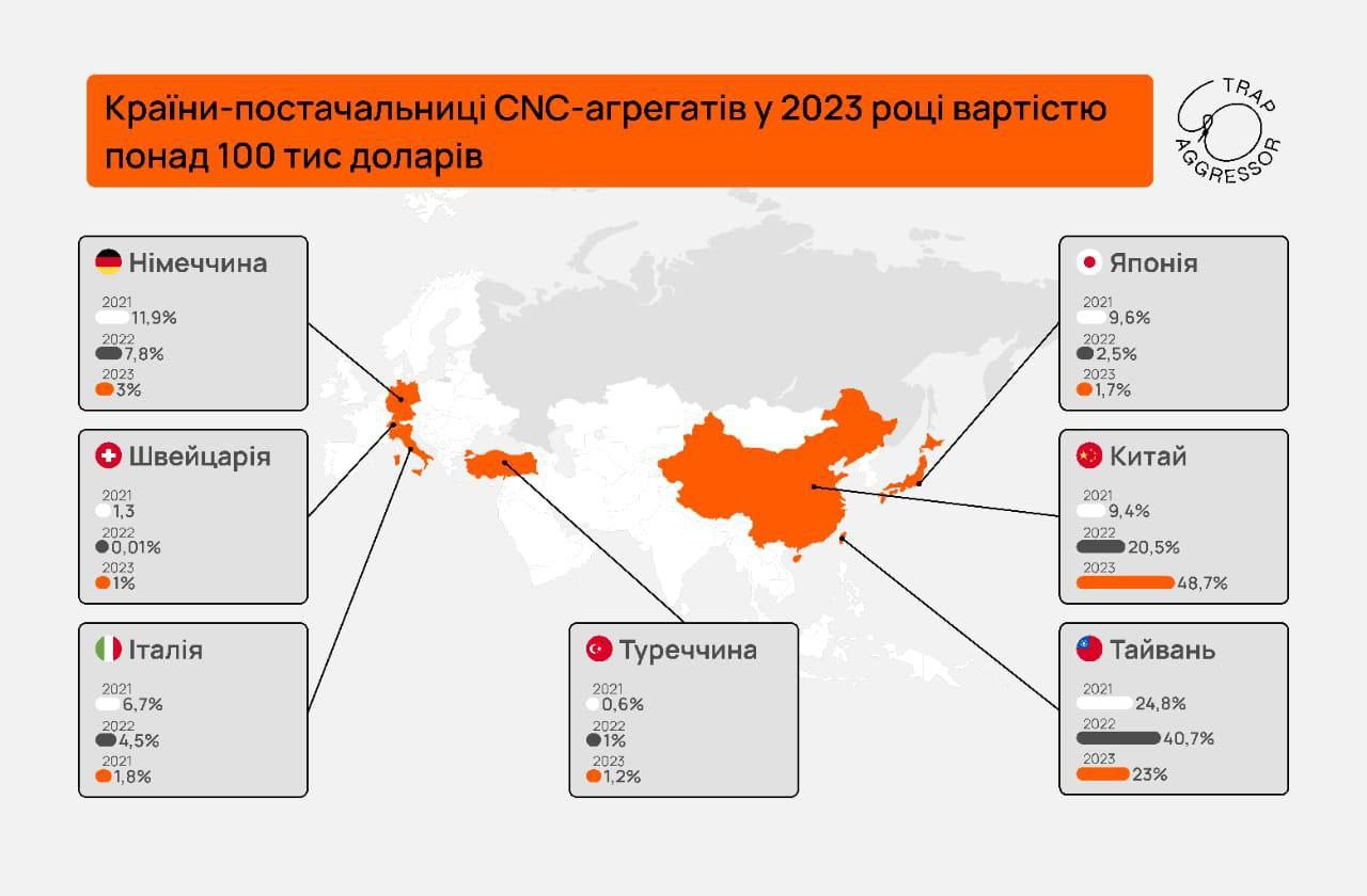 В рамках проекта Trap Aggressor мы исследовали географию и объемы «параллельных» поставок станков с ЧПУ. Среди стран — поставщиков агрегатов в 2023 году стоимостью свыше 100 тыс. долл. США находим Китай, Тайвань, Южную Корею, Германию, Японию, Швейцарию, Турцию, Италию.