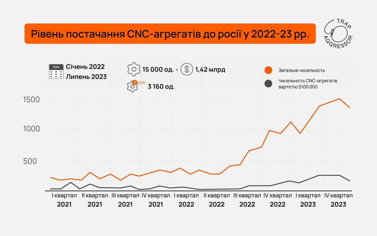 С января 2021 года по июль 2023-го Россия импортировала свыше 15 тыс. станков с ЧПУ общей стоимостью 1,42 млрд долл. Из них 3160 машин стоят более 100 тыс. долл. за единицу.
