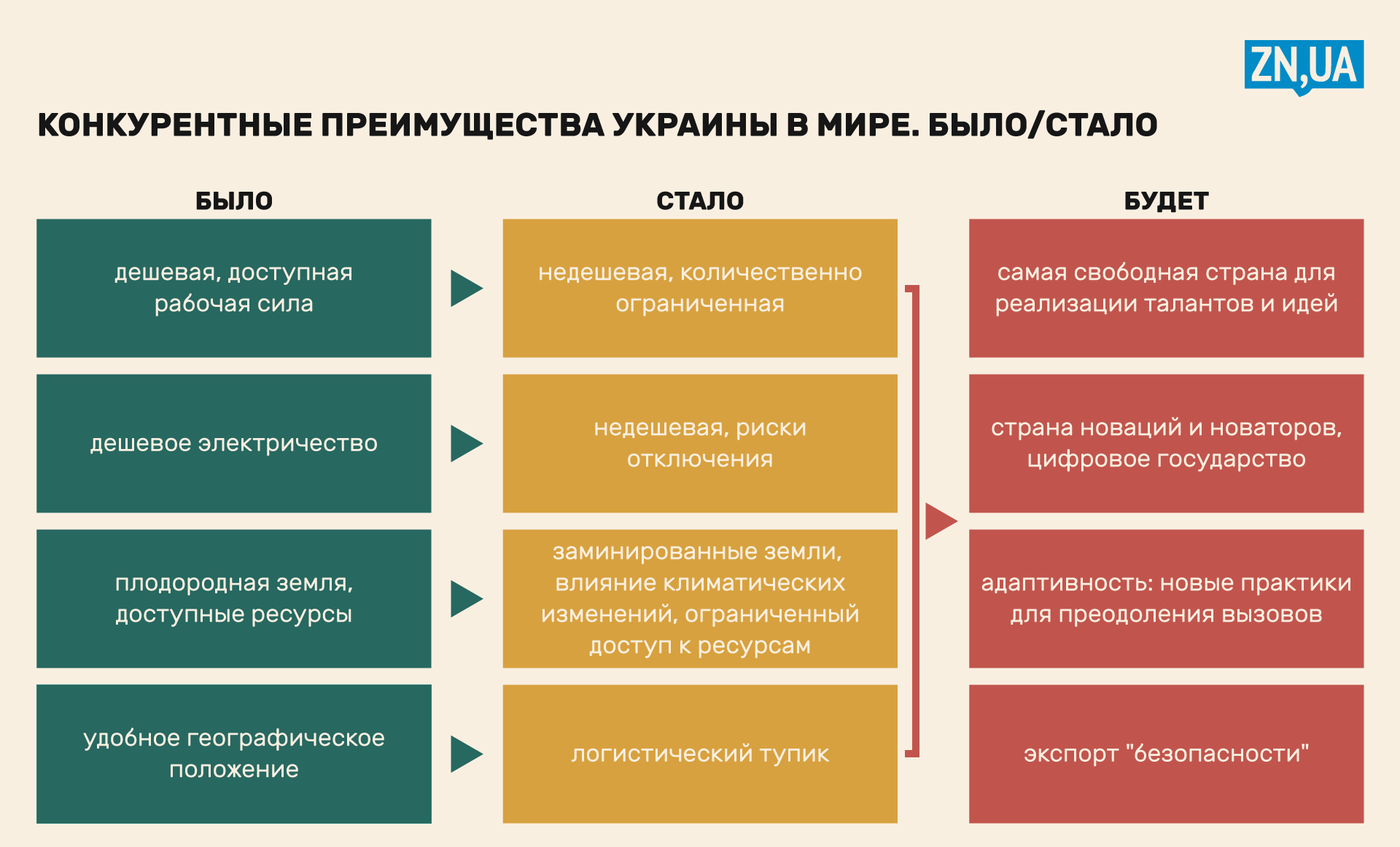 И в завершение основное, то, с чего мы начинали. У Украины раньше было четыре конкурентных преимущества, которые мы условно продавали в мире. Это дешевая рабочая сила, дешевая электрика, дешевая земля и дешевые ресурсы, логистические возможности.