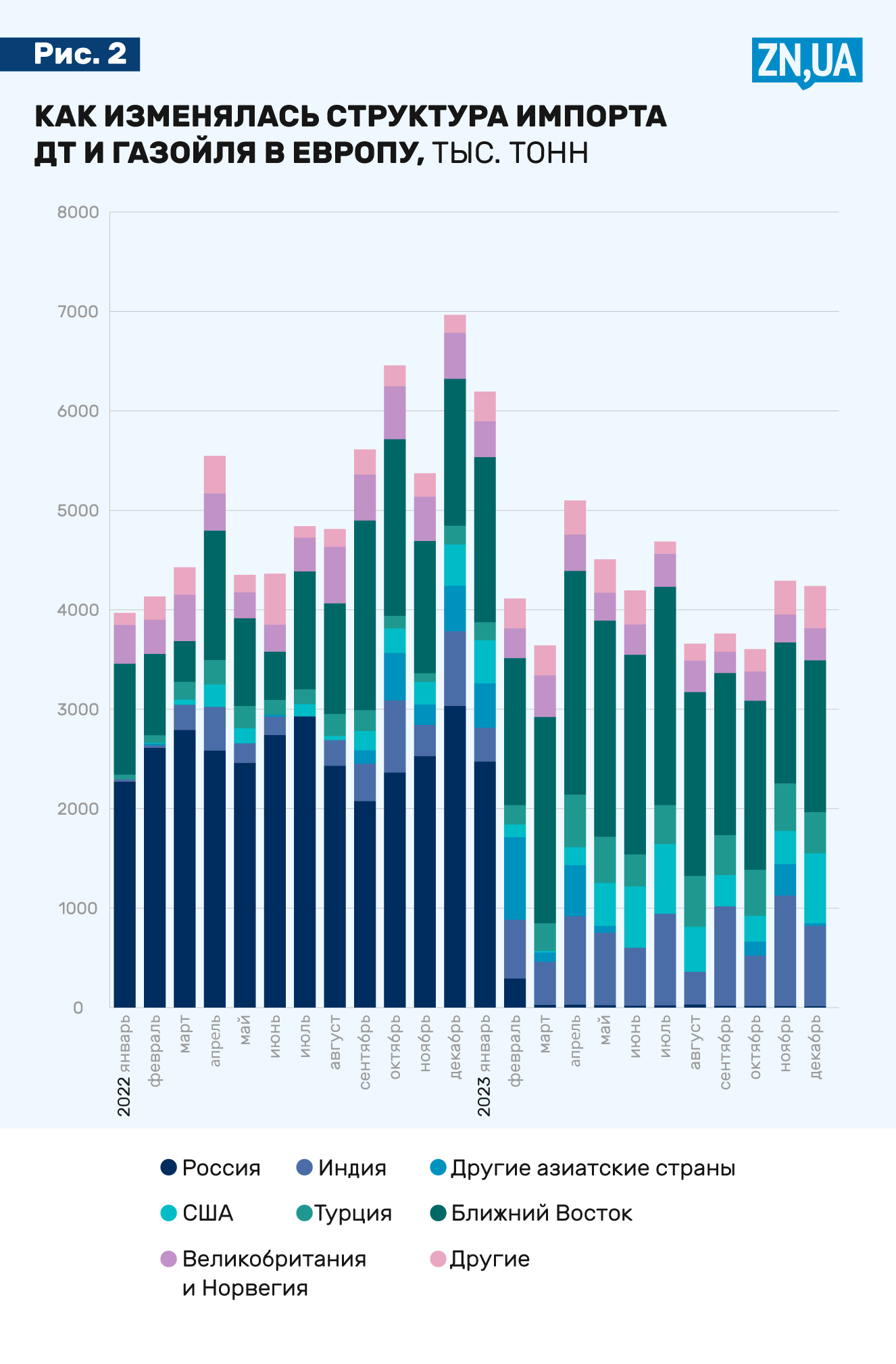 В сентябре 2022 года Европа начала активно скупать дизтопливо со всех направлений, в частности из России. Это дало возможность европейским странам вдобавок к существующим запасам накопить, по разным оценкам, от 6 до 8 млн тонн топлива накануне введения эмбарго. Этими запасами Европа питалась еще несколько следующих месяцев.