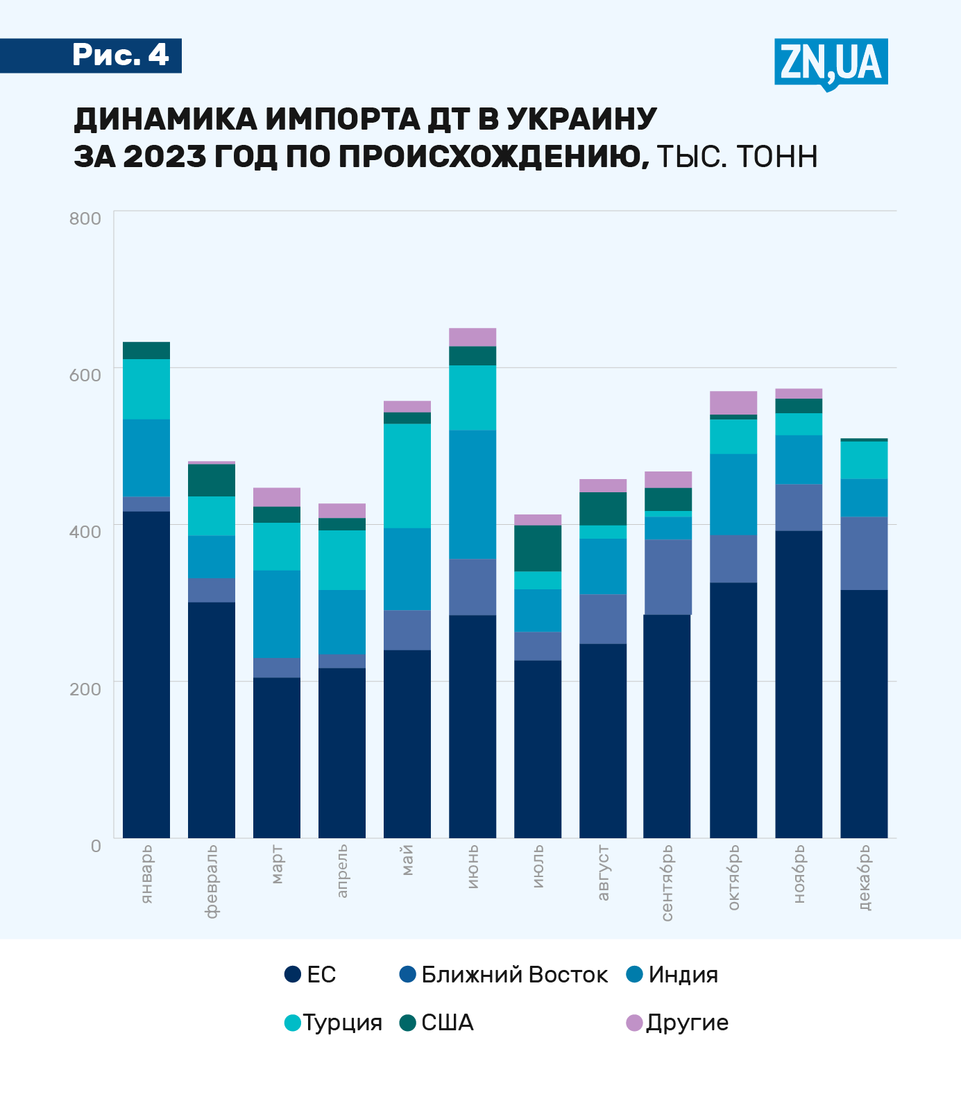 Изменение географии поставки дистиллятов в Европу наложило отпечаток на структуру обеспечения украинского рынка дизтопливом, ведь более 90% его объемов попадает в Украину через европейские порты. Кроме европейского или индийского продукта, обычным явлением для Украины стала закупка топлива из США, Кувейта или ОАЭ (см. рис.4). На протяжении 2023 года в Украину поставлялось дизтопливо из 32 стран. Диверсифицированная структура поставки ДТ, с одной стороны, способствует созданию конкурентной среды, а с другой — обеспечивает определенную устойчивость украинского рынка перед внешними факторами.