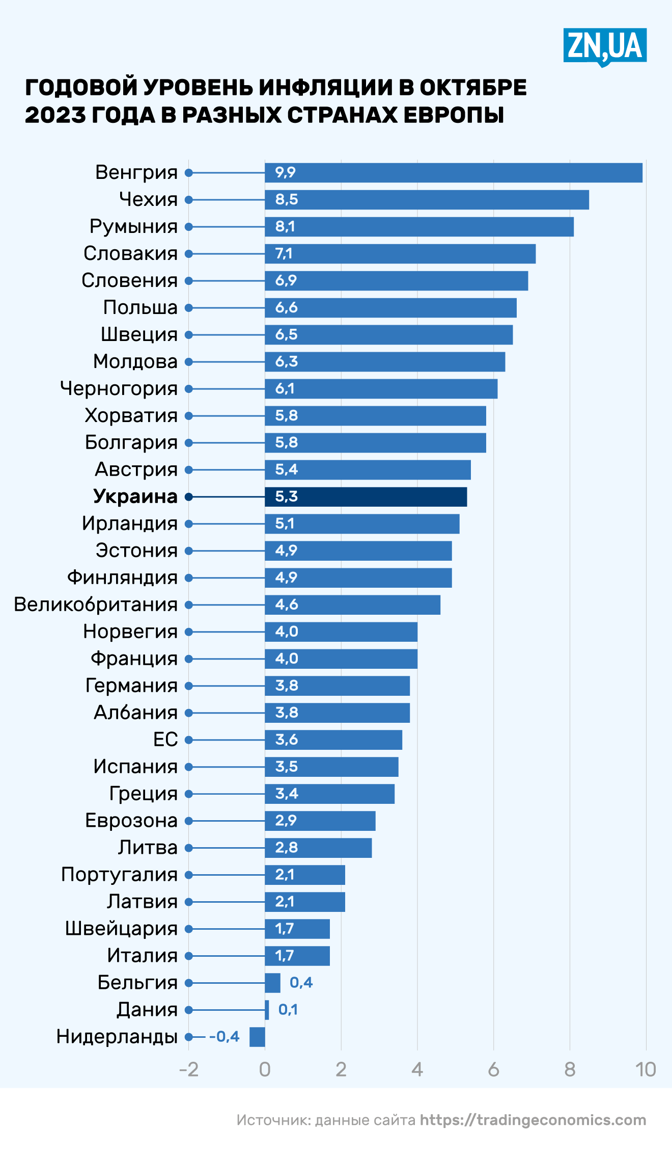 В октябре годовые темпы потребительской инфляции замедлились до 5,3%, что в пять раз меньше уровня на начало года (26,6%). Это прозвучит фантастически, но сейчас инфляция в Украине ниже, чем в большинстве стран Центрально-Восточной Европы и даже на родине старейшего центрального банка в мире, то есть в Швеции. Очевидно, что ситуация нестандартная, и этому должно быть какое-то логическое объяснение.