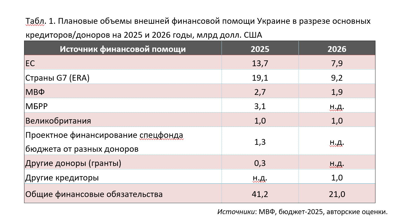 В 2025 году правительство и МВФ ожидают поступления 13,7 млрд долл. от ЕС (из Ukraine Facility), 19,1 млрд долл. по плану ERA от G7 и ЕС (под поток доходов от замороженных российских активов), 3,1 млрд долл. от МБРР, 2,7 млрд долл. от МВФ, 1 млрд долл. от Великобритании и других. Вместе взносы внешних доноров должны обеспечить пополнение бюджета Украины на 41 млрд долл. США.