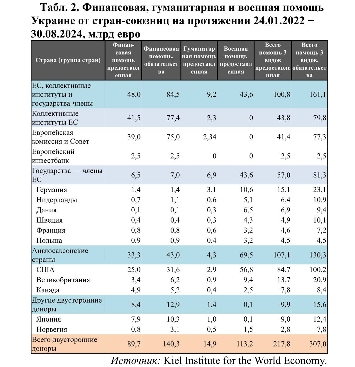 Стоит отметить, что ЕС и его государства-члены с начала войны до 1 сентября 2024 года уже предоставили Украине 48 млрд евро финансовой помощи и 43,6 млрд евро военной помощи (см. табл. 2). В целом объем выделенной помощи от официальных двусторонних доноров достиг 218 млрд евро, в составе которой военный компонент занимает 52%.