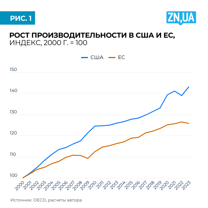 Если темпы роста производительности труда до начала ХХІ века в ЕС и США были близкими, то в дальнейшем Европа все больше отставала от США. Постпандемический период оказал еще большее влияние на увеличение разрыва в производительности труда между еврозоной и США, что было следствием отставания как в структурных факторах, так и в технологическом прогрессе в целом. Так, по данным Евростата и Бюро трудовой статистики США, между 1995-м и 2019 годами производительность труда в один час в США выросла на 50%, или в среднем на 2,1% в год. Тогда как в еврозоне она увеличилась всего на 28%, или на 1% в год (см. рис. 1).