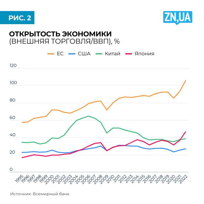 Другим фактором торможения с началом сегментации стало то, что вся европейская экономика в целом была более открытой, чем другие экономические центры мира (см. рис. 2).