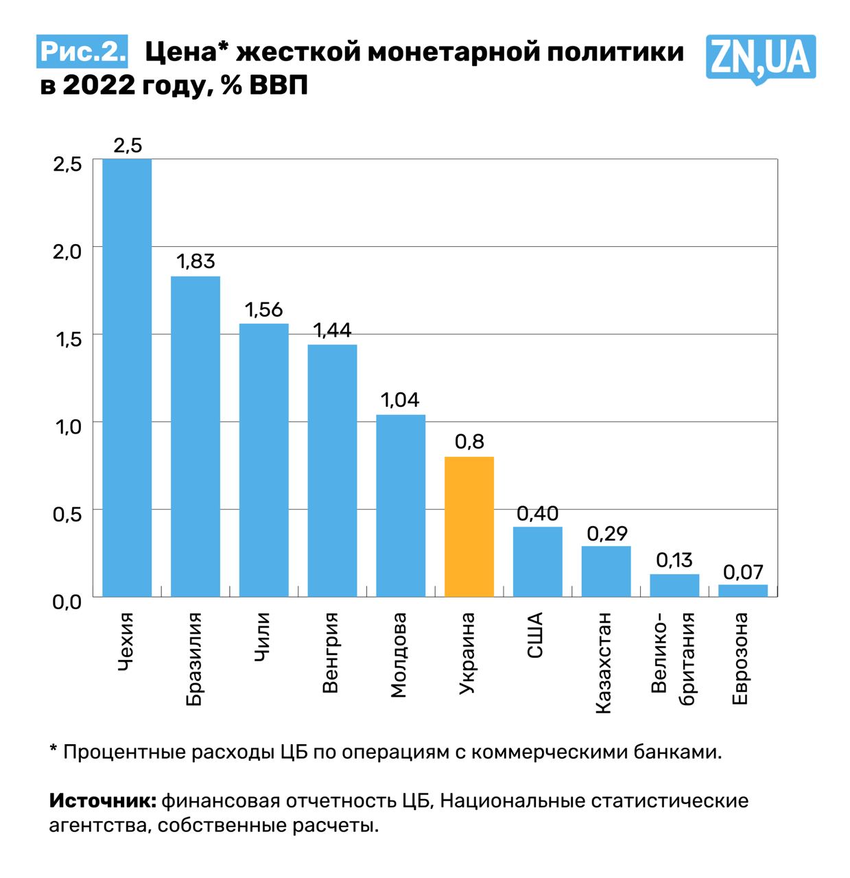 Если определить такие расходы как «прямую цену» проведения монетарной политики для центрального банка и сравнить это значение для Украины и других развивающихся стран, мы получим рис. 2. Быстрое наглядное сравнение указывает на то, что этот показатель для Украины существенно не отличается от показателей других развивающихся стран, которые были вынуждены существенно повысить ключевые ставки в 2022 году. Вместе с тем внимательный зритель может утверждать, что монетарная политика Молдовы была в 2,5 раза более взвешенной и эффективной, чем монетарная политика Чехии. ЦБ Молдовы увеличил ключевую ставку в течение 2022 года на 15 п.п., до 20%, а ЦБ Чехии — на 3,25 п.п., до 7%. При этом Молдова остается одной из самых бедных стран Европы, а Чехия по уровню ВВП на душу населения догоняет отдельные страны Западной Европы. Таким образом, и в этом случае отрыв от контекста (размеров и объемов ликвидности в банковской системе) может значительно искажать любые выводы на основе отдельных показателей.