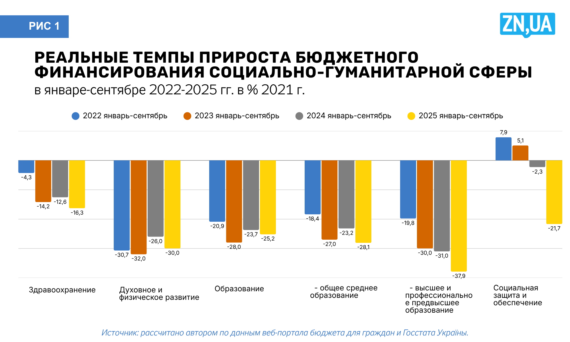 Что касается отдельных составляющих обеспечения социально-гуманитарной сферы, то финансирование здравоохранения в январе—сентябре 2025 года реально уменьшилось на 16% относительно аналогичного периода 2021-го, финансирование образования — на 25%, духовного и физического развития — на 30% (см. рис. 1). Показательно, что финансирование высшего и профессионального предвысшего образования из общего фонда бюджета реально уменьшилось на 44%. Даже программы социальной защиты и обеспечения при введении новых программ для внутренне перемещенных лиц (ВПЛ), ветеранов и инвалидов войны были сокращены на 2%.