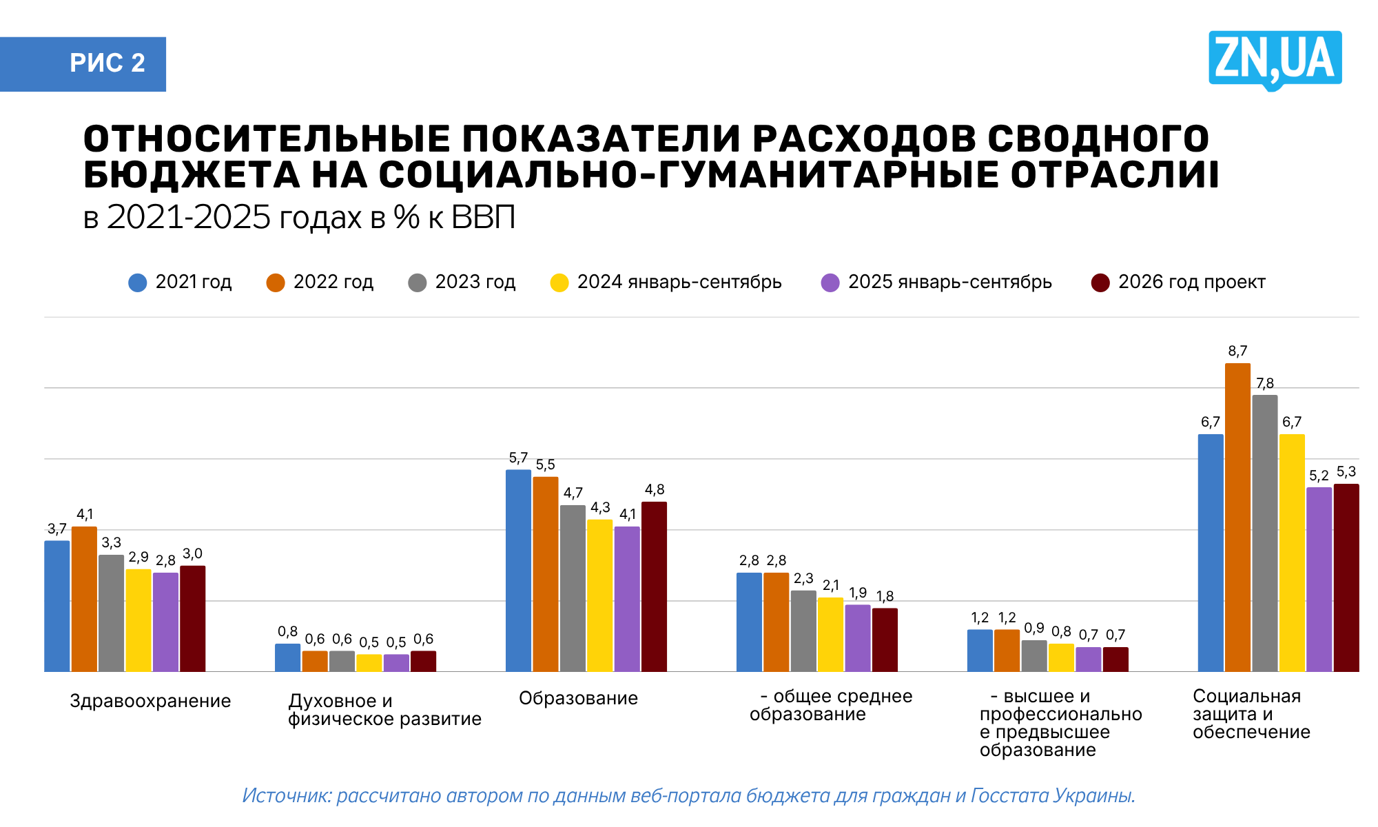 Социально-гуманитарная сфера в военное время столкнулась со значительным сокращением бюджетного финансирования как в реальном, так и в относительном выражениях. Объем расходов сводного бюджета на развитие человеческого капитала и социальное обеспечение сократился с 17% ВВП в 2021 году и 19% в 2022-м до 12,6% ВВП в январе—сентябре 2025 года. На 2026 год проектом бюджета предполагается увеличить расходы на 1,1 процентного пункта ВВП, но и в этом случае они будут на 3,3 п.п. ВВП меньше, чем в 2021 году.