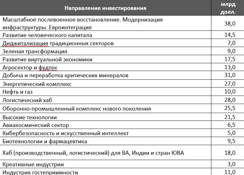 Моделирование свидетельствует, что только за десять лет — с 2026-го по 2035 год — общий объем инвестиций по приоритетным направлениям и детализированным проектам составит около 170 млрд долл. Среди них послевоенное восстановление, развитие ОПК, диджитализация, технологизация, авиакосмический сектор, кибербезопасность и ИИ, энергетика, логистика и т.д.