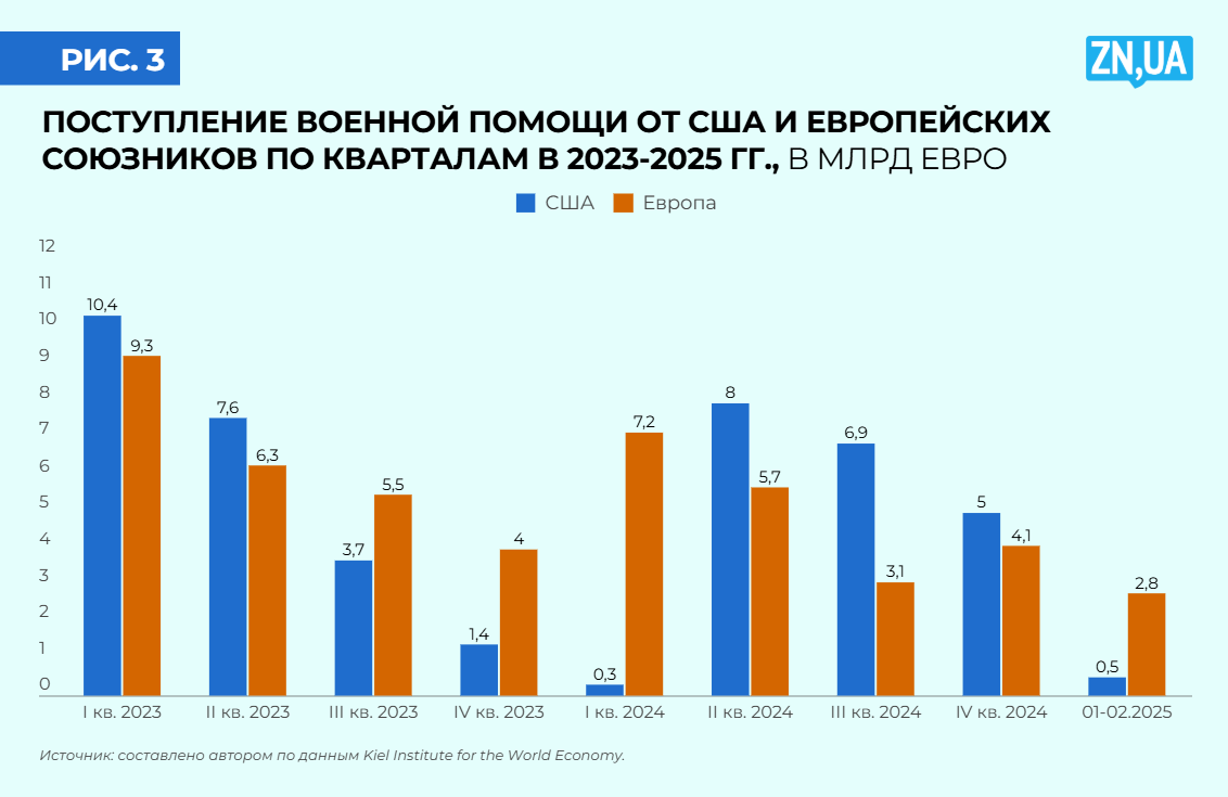 Что касается количественных аспектов этой проблематики, то, по данным Кильского института, военная помощь США в стоимостном измерении равнялась 20,1 млрд евро в 2024 году и 17,8 млрд евро в 2023-м. За январь-февраль 2025-го военной помощи поступило всего лишь на 0,5 млрд евро, а неиспользованное финансирование от предыдущего пакета составило 6,3 млрд евро. Фактические объемы военной помощи США по кварталам и их сравнение с европейской помощью приведены на рис. 3.