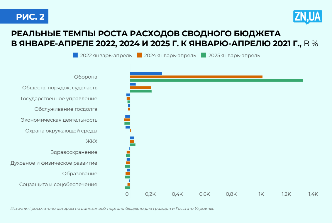 Реальная величина расходов сводного бюджета в январе—апреле 2025 года была на 79,5% больше, чем в январе—апреле 2021-го (см. рис. 2). Восходящий тренд общей суммы расходов наблюдался начиная с 2022 года, получая подкрепление из внешних источников. Общий рост расходов объяснялся исключительно финансированием обороны, правоохранительной деятельности и жилищно-коммунального хозяйства. Только эти три составляющие расходов имели положительные темпы реального прироста. Финансирование обороны в 2025 году в реальном измерении превышало уровень 2021-го почти в 14 раз, а финансирование общественного порядка и безопасности — в 2,6 раза.