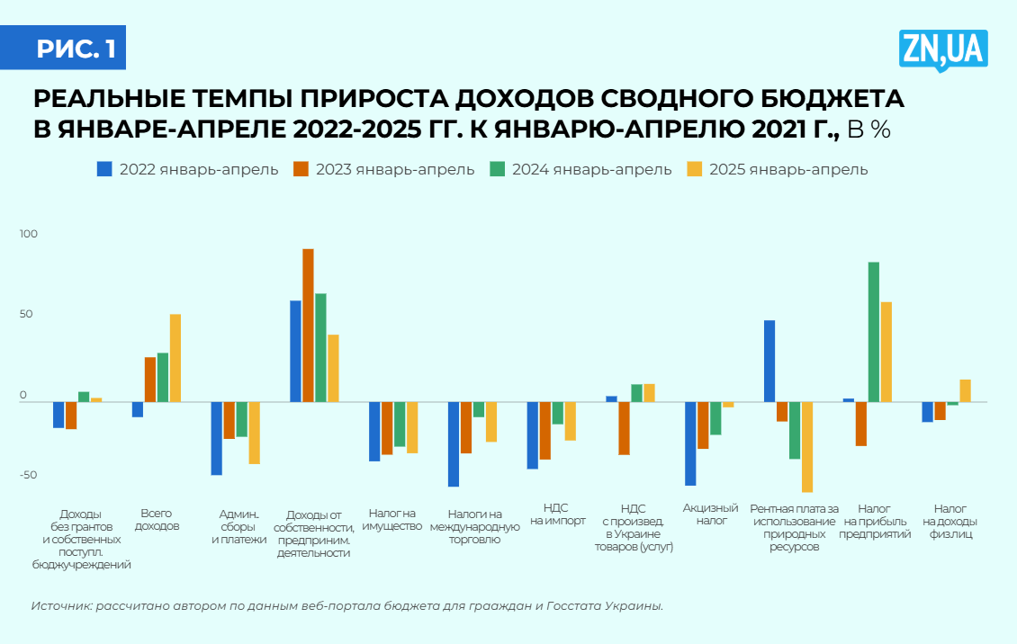 В 2025 году динамика сбора доходов в государственный и местные бюджеты в целом была положительной, хотя и проявлялись некоторые точечные проблемы. В январе—апреле 2025 года абсолютная сумма доходов бюджета Украины выросла на 44,3% относительно аналогичного периода 2024-го, а без учета грантов и собственных поступлений бюджетных учреждений — на 17,6%.