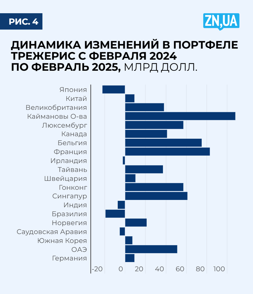 Больше всего трежерис в прошлом году покупали Франция (+83 млрд долл.), Бельгия (+75 млрд) и Каймановы Острова (+108 млрд долл.).
