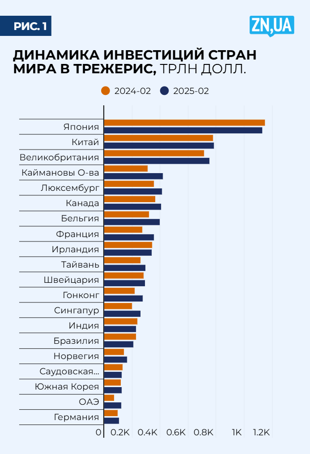 Как видим, больше всего с февраля 2024-го по февраль 2025 года трежерис продавали Япония (-22 млрд долл.) и Бразилия (-19 млрд долл.).