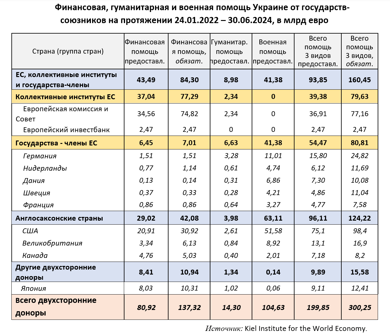 Общая сумма фактически выделенной помощи от двусторонних доноров — 199,9 млрд евро — отставала на 100,4 млрд евро от суммы указанных обязательств. Коллективные институты ЕС и страны-члены с начала большой войны направили в Украину 93,9 млрд евро помощи всех видов. При этом финансовая помощь составляет 46,3%, а военная — 44,1% общей суммы помощи.