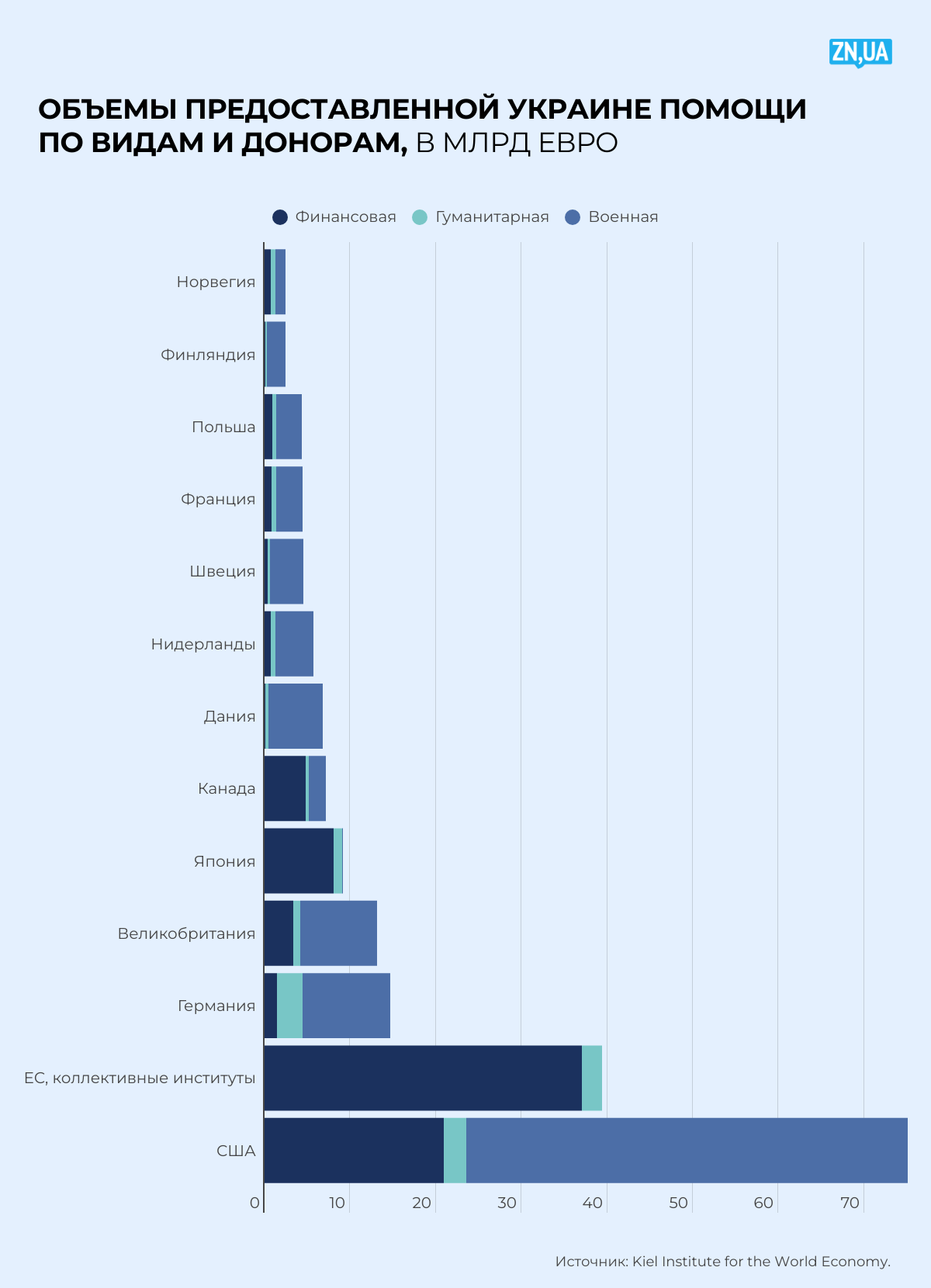 Среди отдельных стран лидерами по предоставлению финансовой, военной и гуманитарной помощи Украине стали США (98,4 млрд евро по сумме обязательств), Германия (24,8 млрд), Великобритания (16,9 млрд), Япония (12,4 млрд), Нидерланды (11,7 млрд), Швеция (11 млрд), Дания (10,1 млрд), Канада (8,2 млрд евро). При этом наибольшие объемы военной помощи предоставили США, Германия, Великобритания, Дания и Нидерланды (см. рис.).