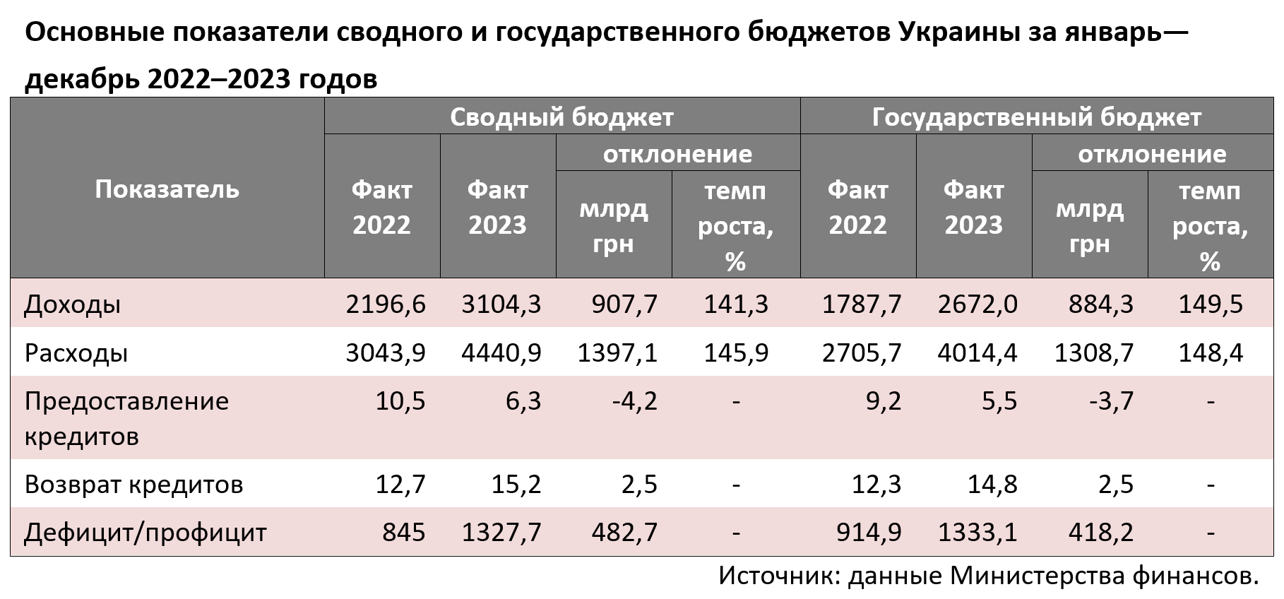 В сводном бюджете поступления доходов в 2023 году по сравнению с 2022-м выросли на 908 млрд грн, или на 141%: с 2,2 трлн до 3,1 трлн грн с одновременным расширением бюджетного дефицита на 483 млрд грн (с 845 млрд до 1,33 трлн грн).