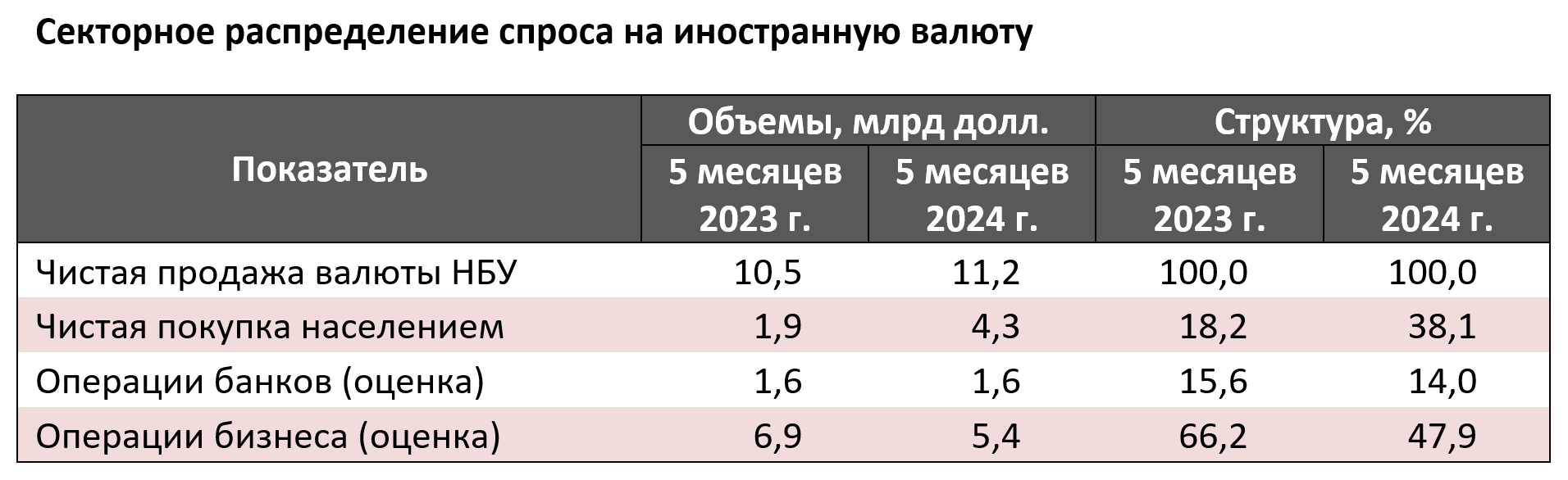 За пять месяцев 2024-го доля населения и мелкого бизнеса в спросе на валюту составляла 38%, что более чем вдвое превышает показатели прошлого года. Тогда доля населения составляла всего 18% (см. табл.).