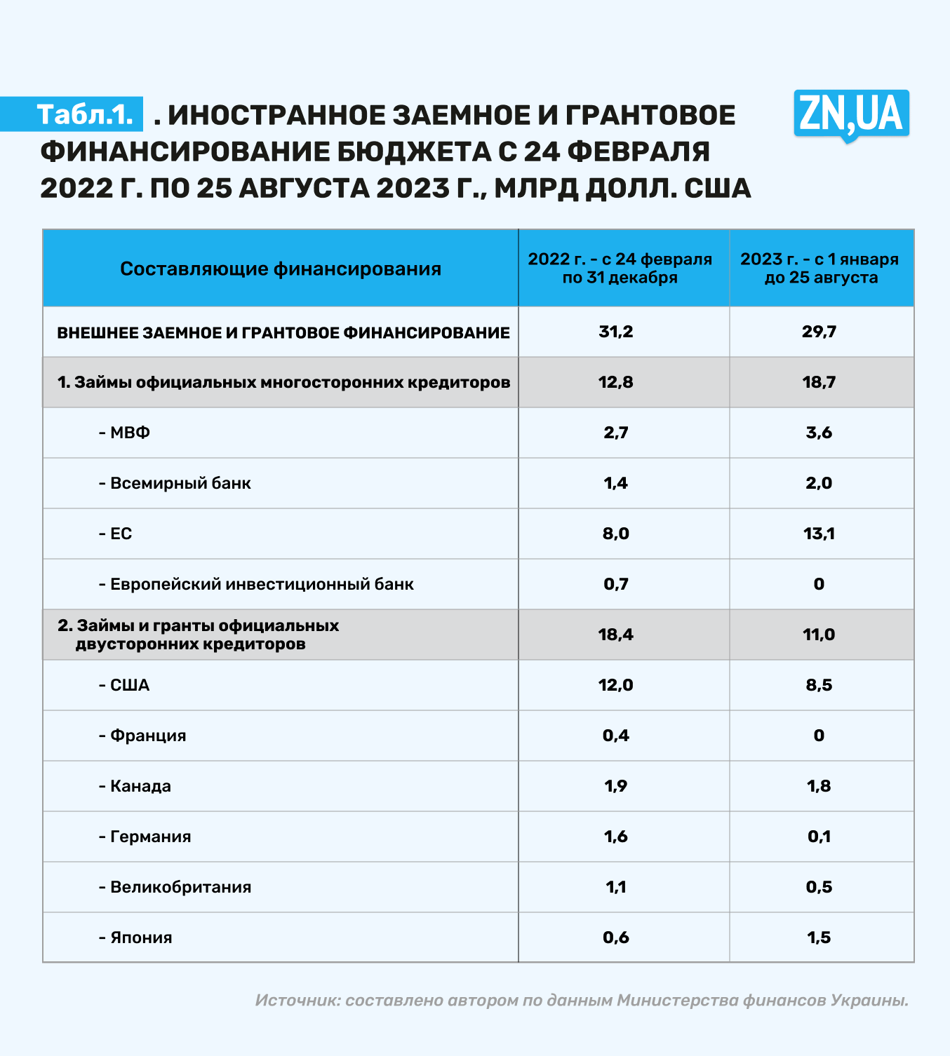 С 1 января по 25 августа 2023 года Украина получила 29,7 млрд долл. США финансовой помощи от иностранных официальных доноров в государственный бюджет (см. табл. 1).