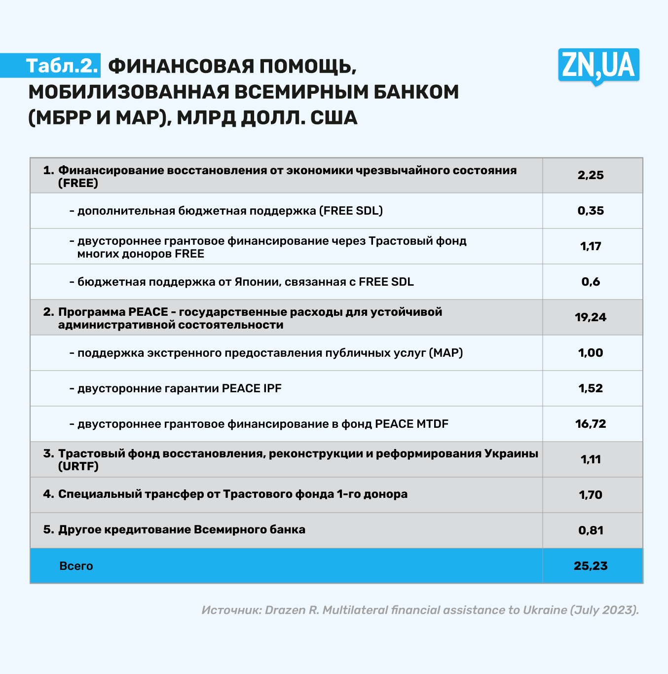 Учреждения Всемирного банка МБРР и МАР с начала войны мобилизовали и использовали собственных ресурсов для поддержки Украины на сумму 25,2 млрд долл. В целом 18 стран сделали взносы в трастовые фонды Всемирного банка. При этом основным донором выступало правительство США (19,3 млрд долл.). Программа PEACE стала крупнейшим компонентом пула финансовой поддержки (см. табл. 2).
