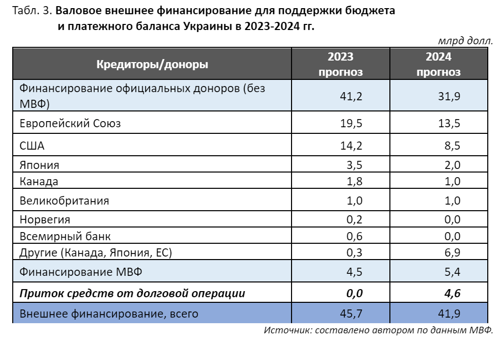 В декабре 2023 года при пересмотре программы EFF МВФ повысил оценку потребностей Украины во внешнем финансировании на период до 2027 года с 114 млрд до 122 млрд долл. в связи с увеличением планового дефицита бюджета. По оценкам МВФ, у Украины неплохие перспективы получить это финансирование, особенно с учетом готовности ЕС утвердить 50-миллиардный пакет помощи нашей стране.