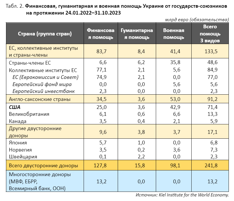 В части бюджетной поддержки наибольшим донором Украины в 2023 году стали коллективные институты ЕС, от которых на середину декабря получено 16 млрд евро кредитных средств. США выделили 10,9 млрд долл. грантовой помощи. Значительные объемы льготных кредитов и гарантий поступили от правительств Канады (1,8 млрд долл.), Японии (1,5 млрд долл.) и Великобритании (1 млрд долл.).