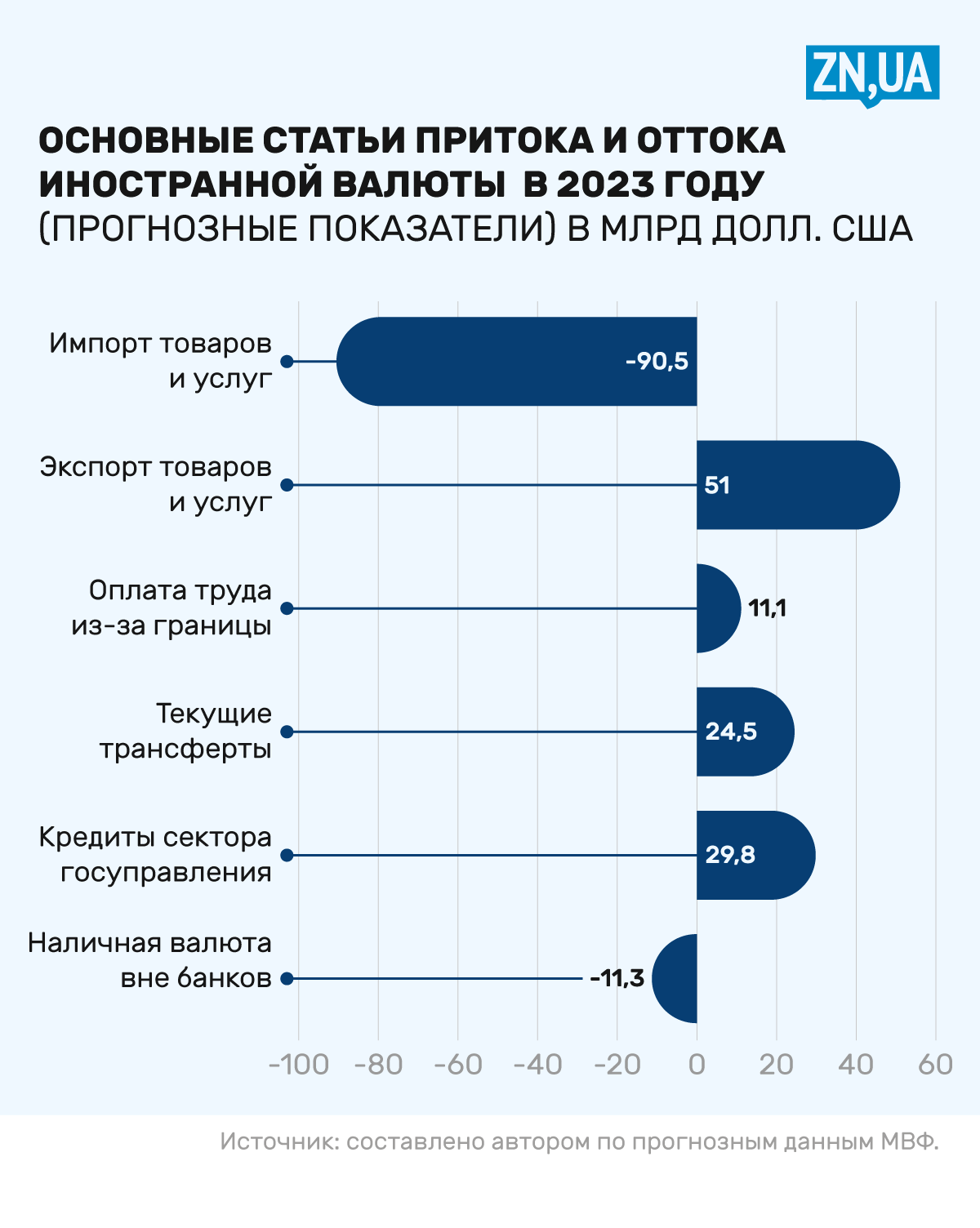 Кроме внешнеторговых сделок, отток валюты происходит и из-за приобретения внешних финансовых активов резидентами. Данные рисунка указывают на основные статьи притока и оттока иностранной валюты в Украине в 2023 году.