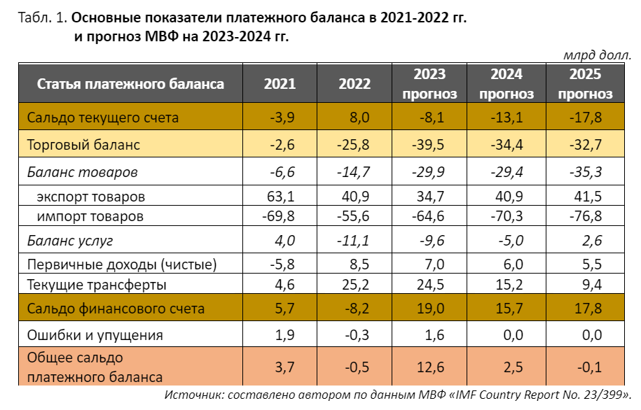 Дефицит текущего счета платежного баланса в 2023 году ориентировочно составит 8,1 млрд долл. США, или 4,6% ВВП, при том что в 2022-м наблюдался профицит в сумме 8 млрд долл. Положительное сальдо финансового счета в 2023 году может достичь 19 млрд долл., тогда как в 2022-м это сальдо было отрицательным (см. табл. 1). Отток валюты по текущим операциям при излишке ее поступлений по финансовым дает плюсовое общее сальдо баланса, которое в 2023 году будет равняться почти 12,6 млрд долл.
