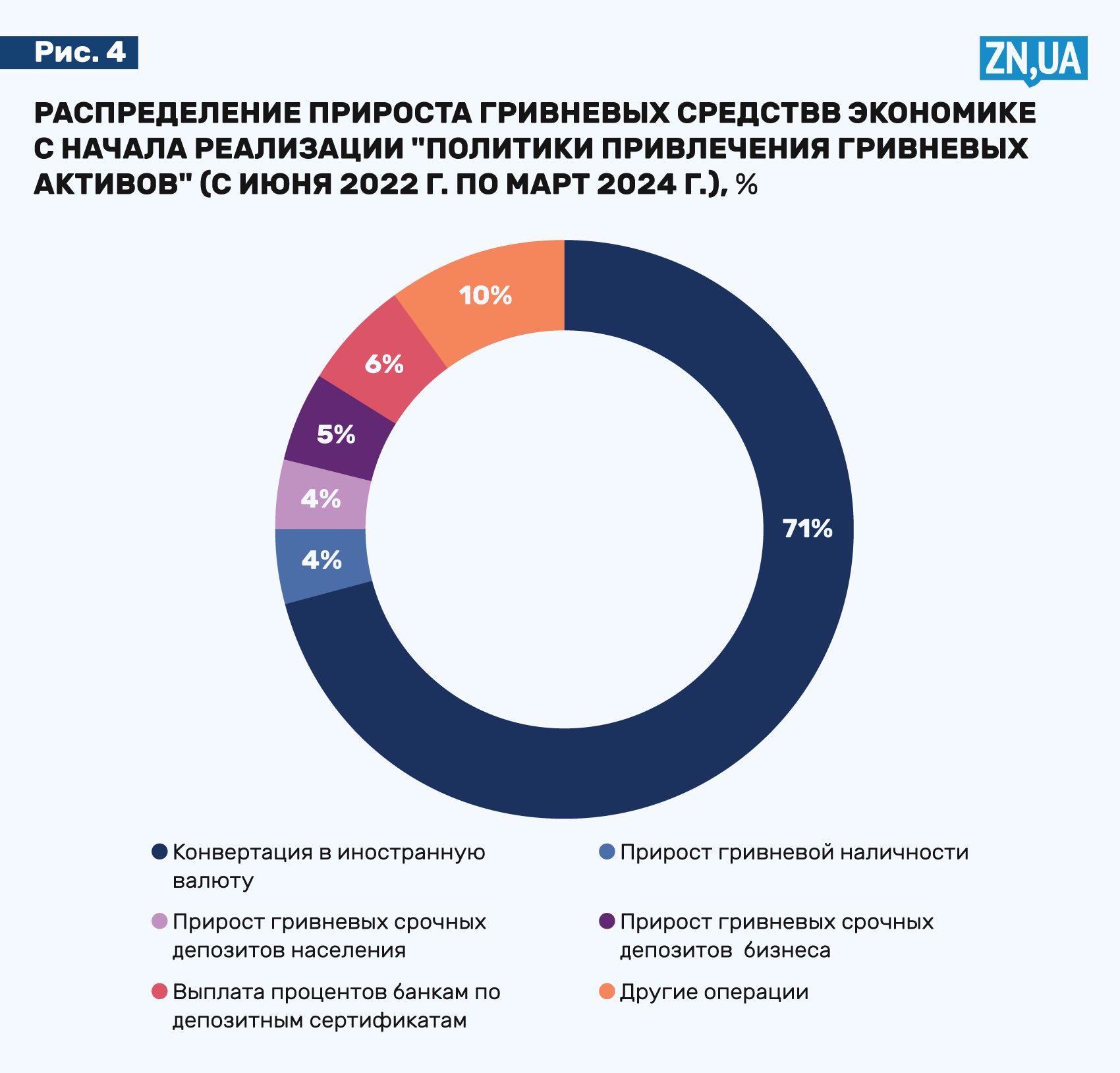 С начала реализации «политики привлечения гривневых активов» (с июня 2022 года) и по март 2024-го в банковскую систему поступило 2,6 трлн грн преимущественно в результате финансирования фискального дефицита за счет средств международной помощи.