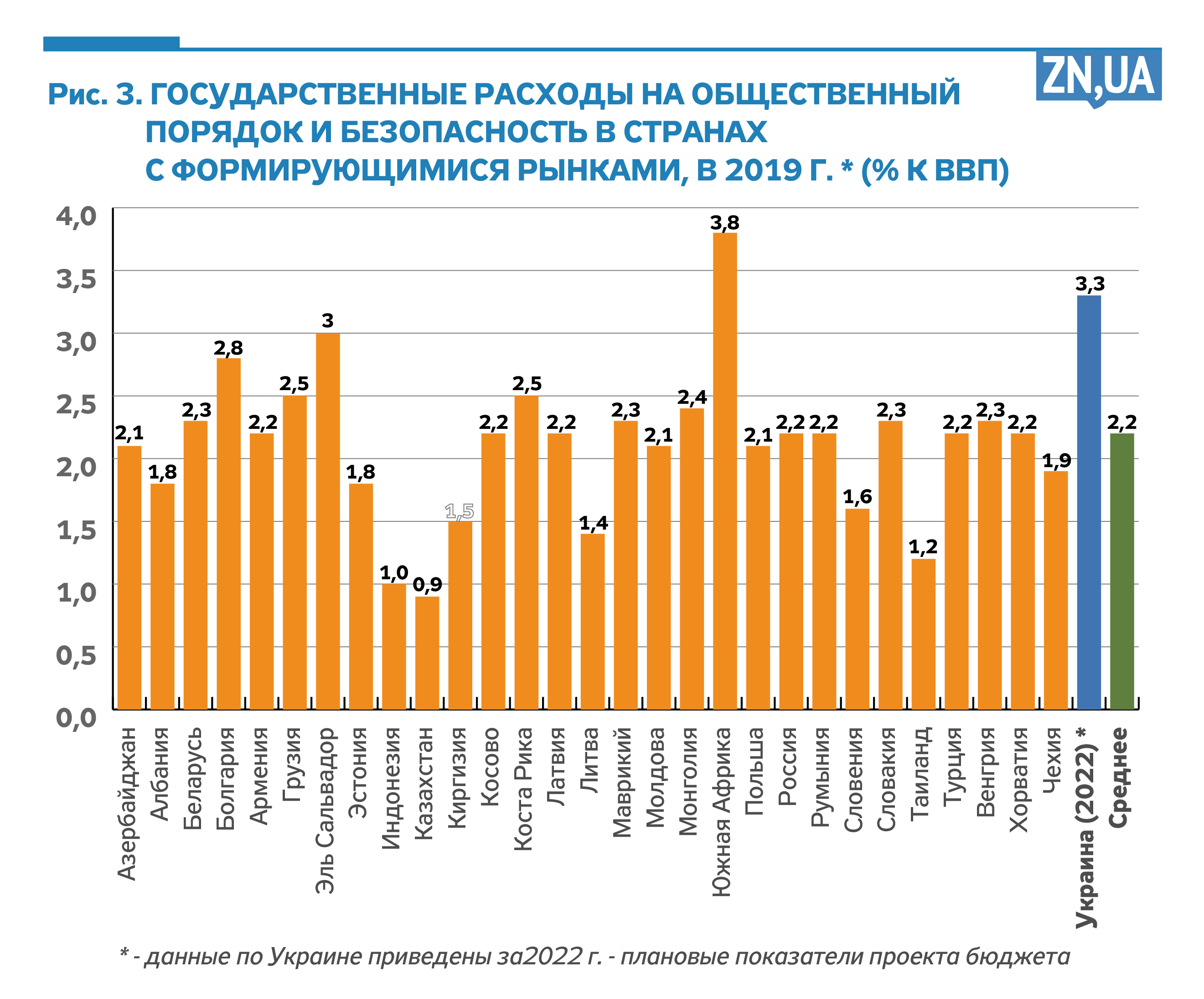 Одним из способов консолидации государственных финансов Украины в 2022 году станет сокращение расходов по функции «общественный порядок, безопасность и судебная власть». По сравнению с 2020-м финансирование этой функции должно быть уменьшено на 0,5 п.п. ВВП. Но даже после такого сокращения уровень ее финансирования останется необоснованно высоким. Так, среди стран с формирующимися рынками украинский показатель расходов на общественный порядок и безопасность — 3,8% ВВП в 2020 году и 3,3% ВВП в 2022-м — является вторым по величине после Южной Африки (см. рис. 3). А средний уровень таких расходов в странах с формирующимися рынками составлял 2,2% ВВП.