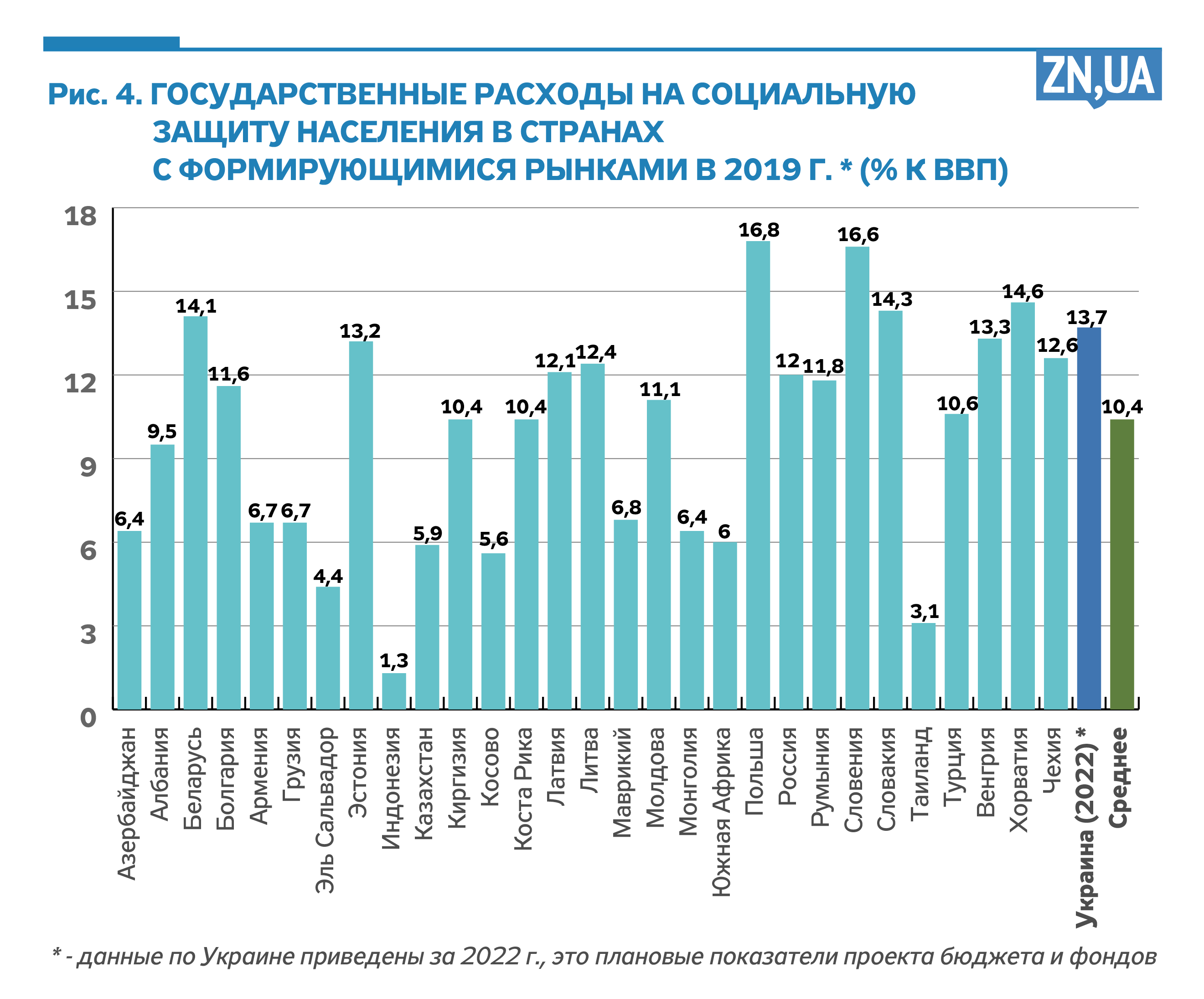 Для исследования феномена чрезмерности или недостаточности расходов на социальную защиту населения были проведены международные сравнения по сектору общего государственного управления на основе базы данных МВФ GFS-COFOG (см. рис. 4). Как видим, расходы сводного бюджета и государственных фондов социального страхования в Украине на уровне 13,7% ВВП превышают средний показатель в странах с формирующимися рынками — 10,4% ВВП. Но ряд европейских стран — новых членов ЕС тратят на социальные программы большую часть своего ВВП по сравнению с Украиной.