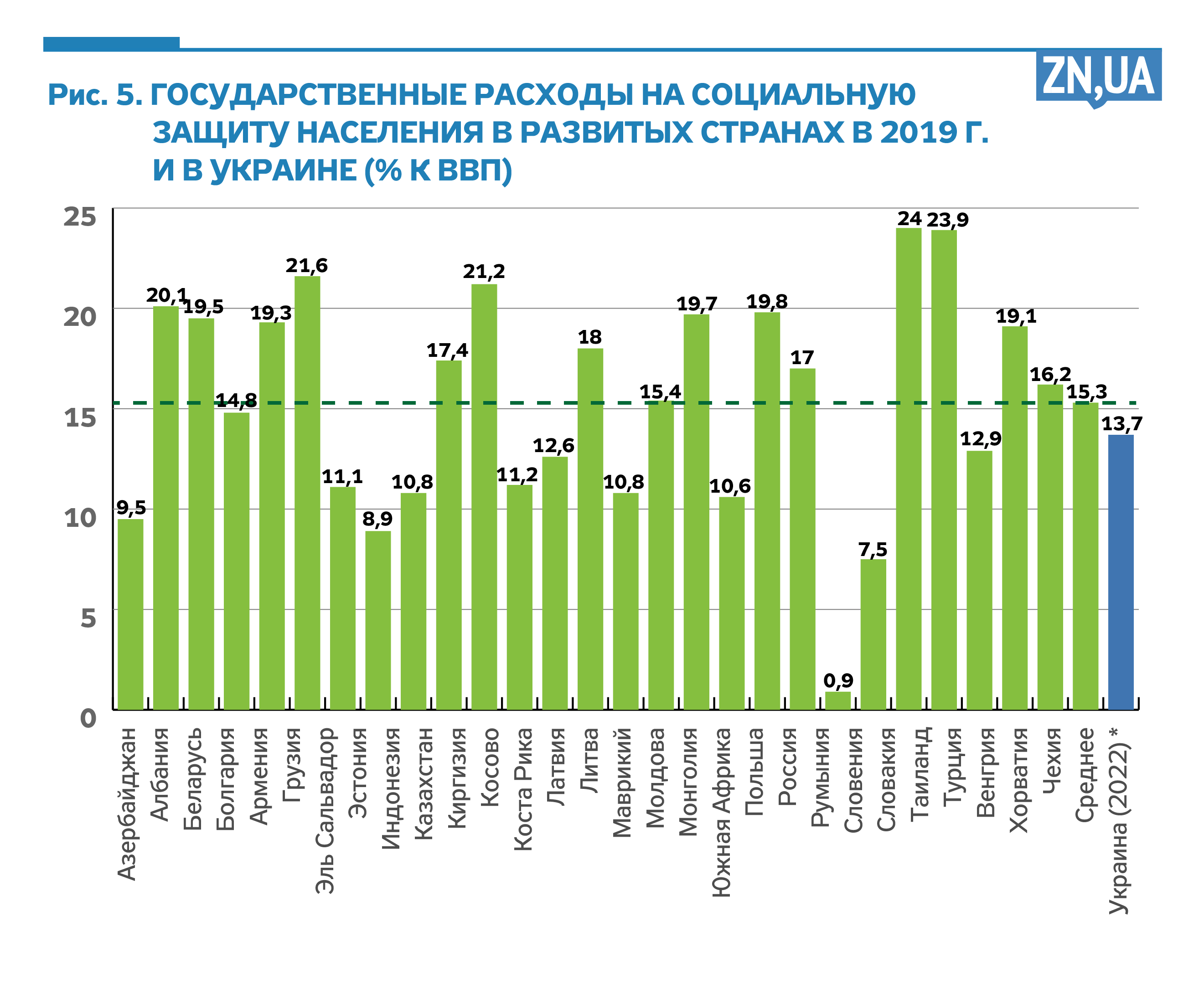 Сравнение расходов на социальную защиту населения в Украине с развитыми странами приведено на рис. 5. В развитых странах средний уровень таких расходов составлял 15,3% ВВП, несколько превышая украинский показатель.