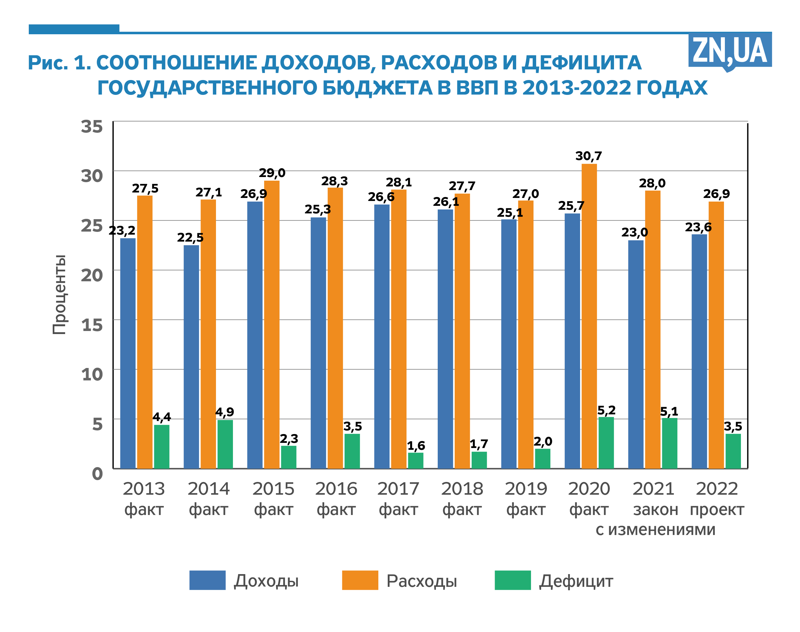 В этом проекте доходы государственного бюджета запланированы в сумме 1267,4 млрд грн, или 23,6% ВВП, а расходы — 1441,9 млрд грн, или 26,9% ВВП. То есть расходы будут примерно на уровне 2019 года и уменьшены на 3,8% ВВП относительно 2020-го (см. рис. 1). Учитывая постепенный выход страны из кризиса и достижение предкризисного уровня производства в 2022 году, некоторое уменьшение относительной величины бюджетных расходов можно считать оправданным.